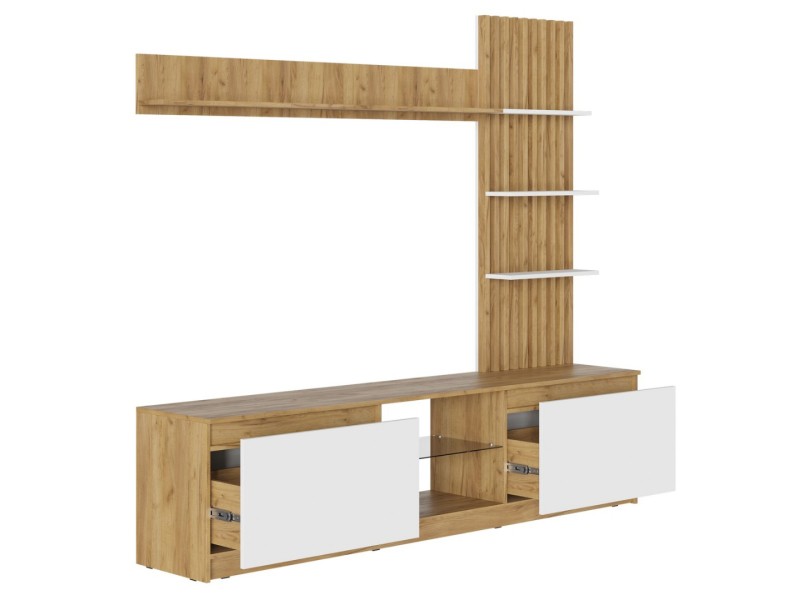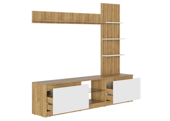 Небольшая по габаритам и элегантная стенка Бостон будет прекрасно смотреться в интерьере вашей гостиной. Функциональность в сочетании с изящным видом – главное достоинство стенки. В ее конструкции предусмотрено три открытых полки, ниша со стеклополкой, а также два объемных выдвижных ящика с повышенной грузоподьемностью.