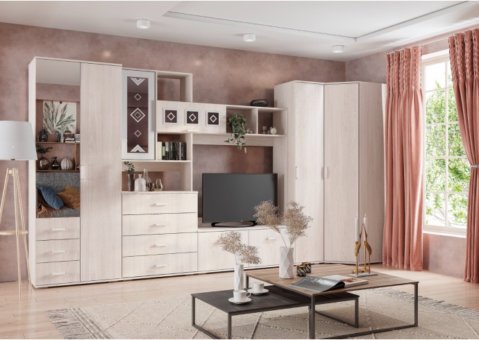 Гостиная "Белла" - это функциональная стилизованная модель. Особый шарм ей придаёт сочетание корпуса и фасада в цвете "ясень белый", а также отделка зеркалами с пескоструйной обработкой и еврокромкой. Удобная зона для ТВ, вместительные выдвижные ящики, закрытые и открытые полки позволяют максимально эффективно использовать пространство.