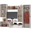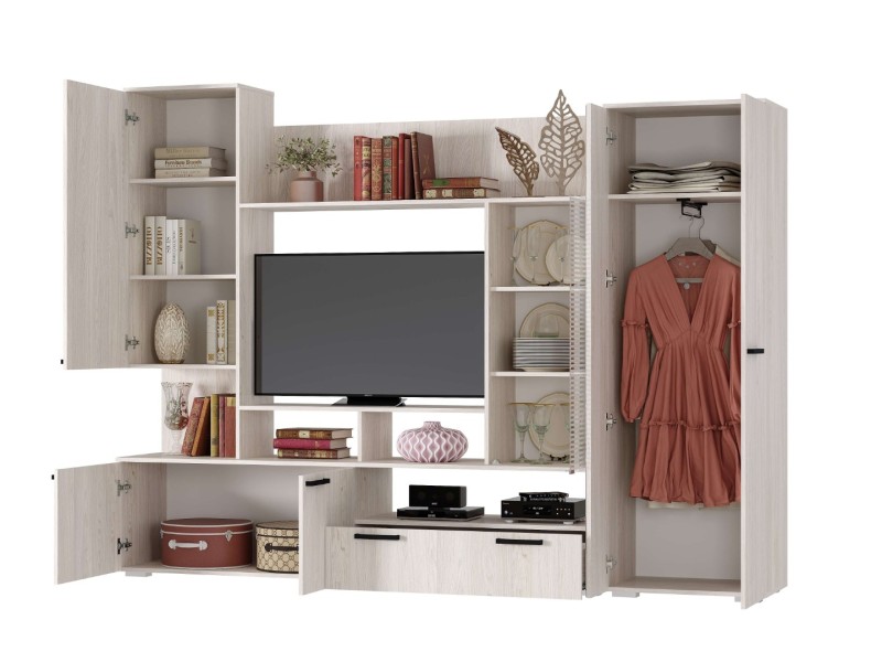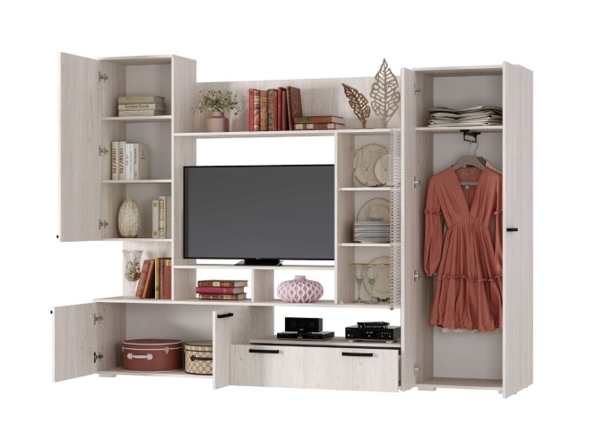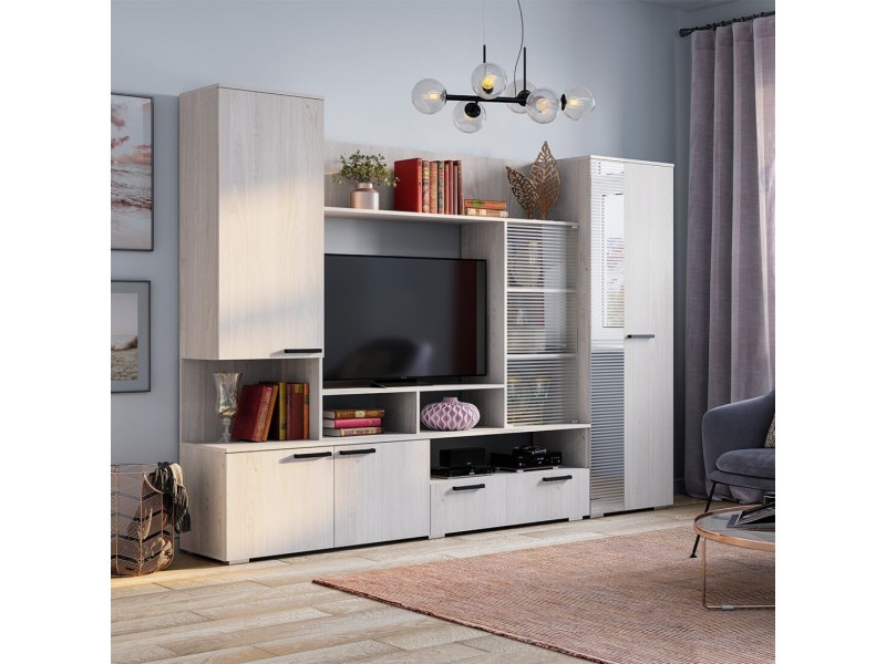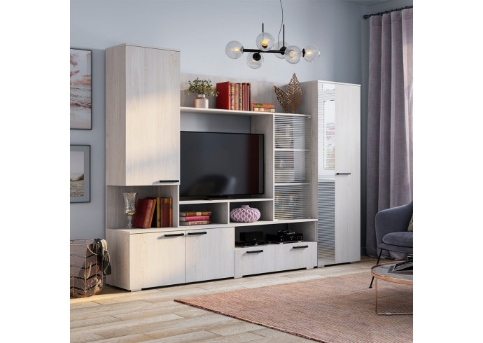 Гостиная "Денди" - грамотно продуманная система хранения оснащена закрытым двустворчатым шкафом, пеналом, зоной под ТВ, открытыми и закрытыми полками, на которых можно разместить домашнюю акустику, любимые книги или изящные статуэтки. С одной из сторон ТВ-зоны находятся три полки со стеклянной дверцей. Особый шарм ей придаёт пескоструйный декор в виде горизонтальных линий по всей площади поверхности. В едином стиле декорировано стекло, прилегающее к ближайшей створке распашного шкафа. Шкаф состоит из вместительной зоны выдвижной штангой для хранения платяных изделий и антресольной полки.