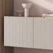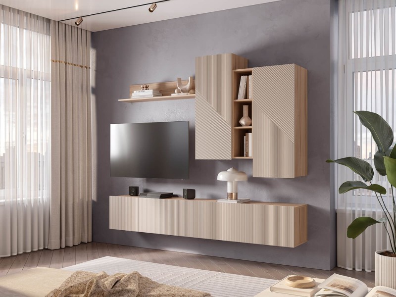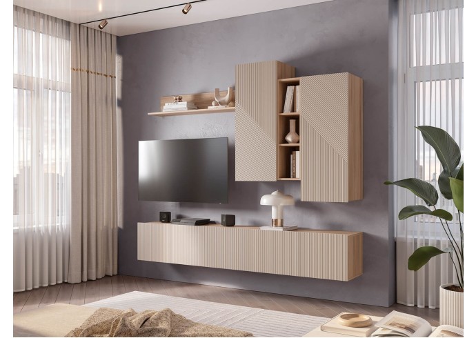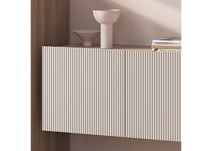 Гостиный модуль "Эмилия" ГМ-12 включает в себя ассиметричные шкафчики и длинную стильную рейку, что придает дизайну коллекции индивидуальность. В шкафчиках находится по две вместительных полки, а между ними расположены открытые узкие полки, которые идеально подойдут для хранения сувениров и элементов декора.