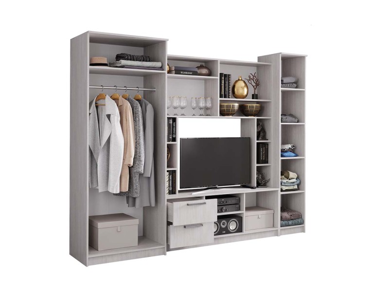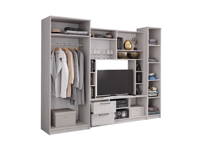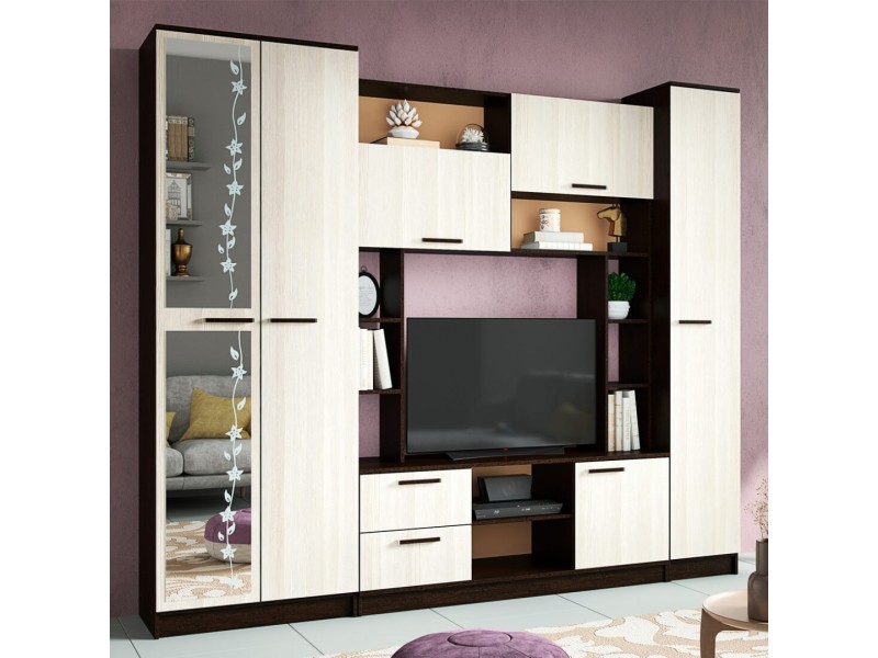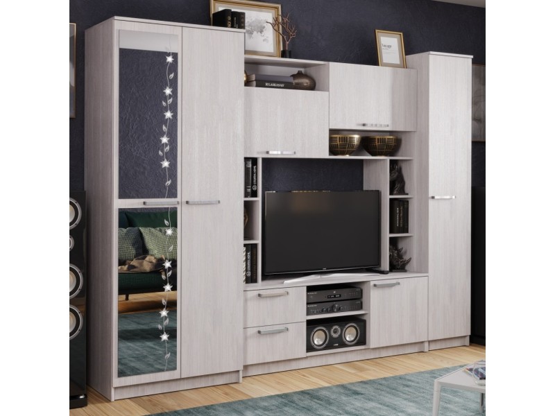 Гостиная "Флора" невероятно вместительный вариант. В ней вы сможете расположить телевизор, всю необходимую аудиотехнику, а верхние и нижние ящики прекрасно подойдут для документов и личных вещей. Модель гостиной "Флора" имеет два полноценных шкафа, один из которых двустворчатый и оснащен штангой для вешалок с вашей одеждой. Наличие зеркальной дверцы с лаконичным цветочным принтом позволяет расширить пространство, а светлые фасады в цвете "ясень белый" облегчают всю конструкцию.