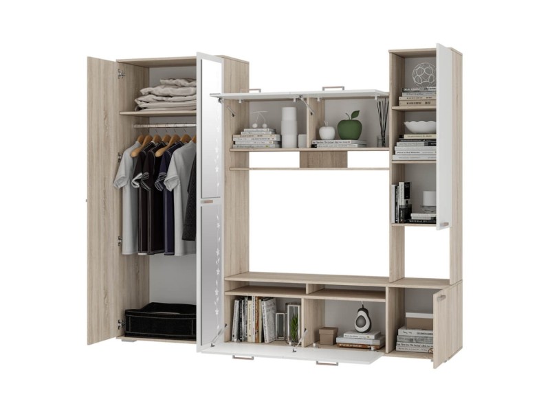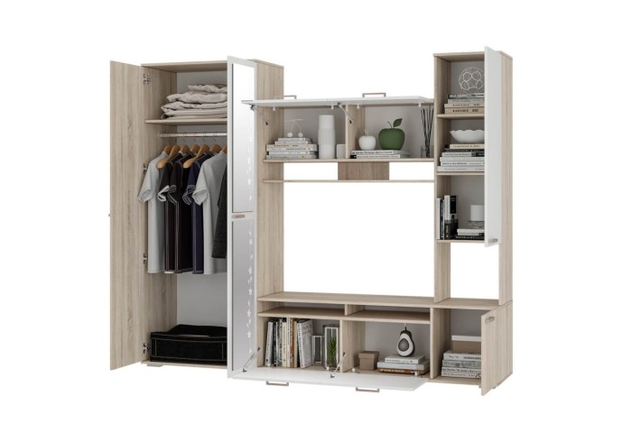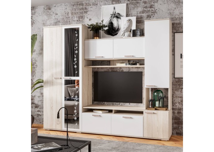 Компактный гарнитур «Лукас» – это функциональная стилизованная модель с простыми геометрическими формами и множеством полезного пространства. Контрастное сочетание фасадов белого цвета с древесной фактурой дуб сонома, а также отделка зеркалами станут ярким акцентом любого интерьера.