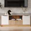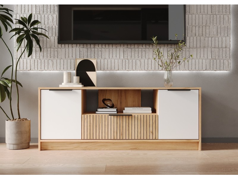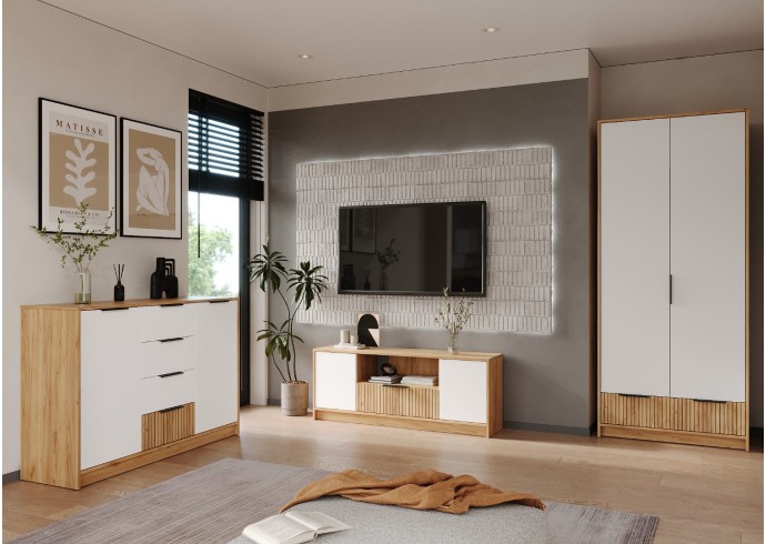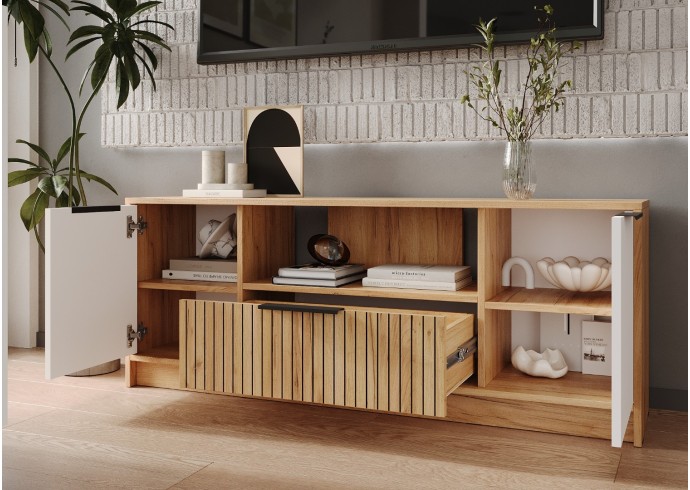 «ИВИС ТВ-тумба ТМ-001» имеет следующие характеристики и особенности конструктива: Тумба логически разделена на три части: одну центральную и две боковых. По центру тумбы в нижней ее части расположен ящик на шариковых направляющих полного выдвижения длиной 300 мм, полезным габаритом Д.571хВ.138хГ.268мм. Фасад ящика выполнен из материала ЛДСП (каркас) 16мм, на него нанесена фотопечать, имитирующая вертикальную фрезеровку. Открывание ящика производится за Ручка-профиль СП-1 (160/188) чёрный матовый. Между ящиком и крышкой стола располагается открытая ниша для хранения. Габариты ниши Д.628хВ.206хГ.310мм. В задней части ниши располагается вязка, усиливающая жесткость конструкции. По бокам ТВ-тумбы расположены два идентичных закрытых отсека с полками. Габариты отсеков Д.329хВ.418хГ.310мм. Отсеки закрыты вкладными створками, изготовленными из ЛДСП (фасад) 16мм, открывание производится за Ручка-профиль СП-1 (160/188) чёрный СМК ТО 097-2024 14 матовый. Пространство каждого из отсеков делится одной полкой на две части высотой 184 и 218мм соответственно. Задние стенки из белого ЛХДФ, являются набивными(накладными), в кол-ве 3шт. Соединяются между собой - Планкой соединительной для ДВП. Опоры - подпятник черный.