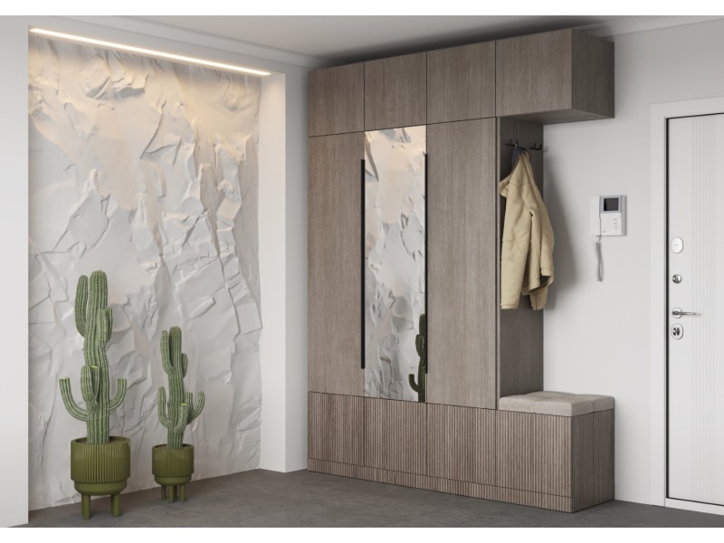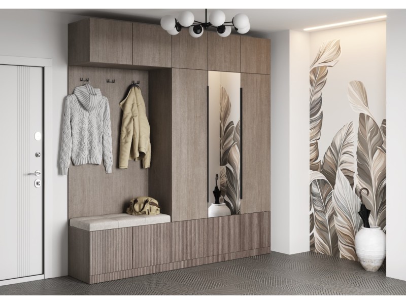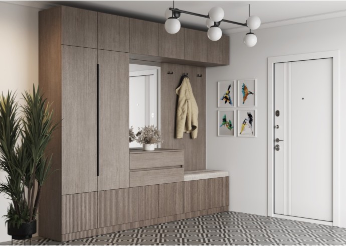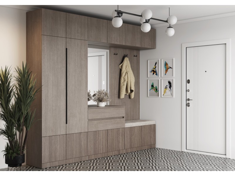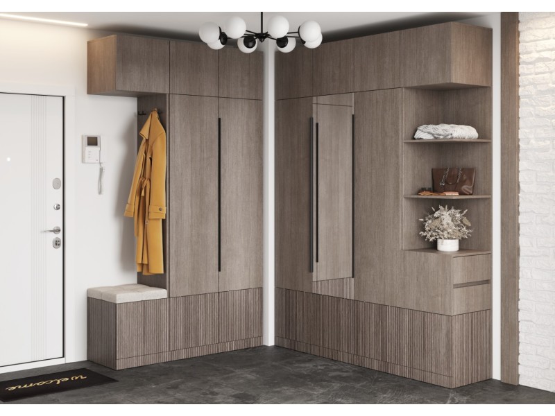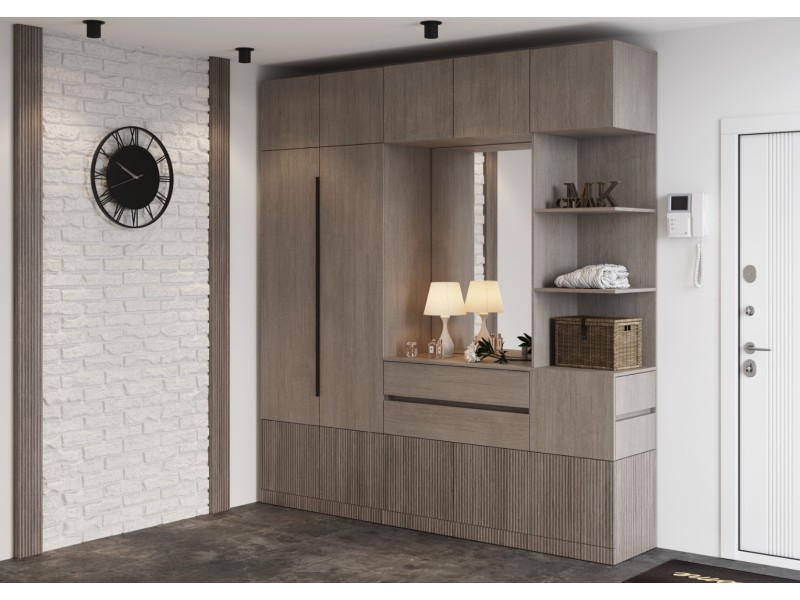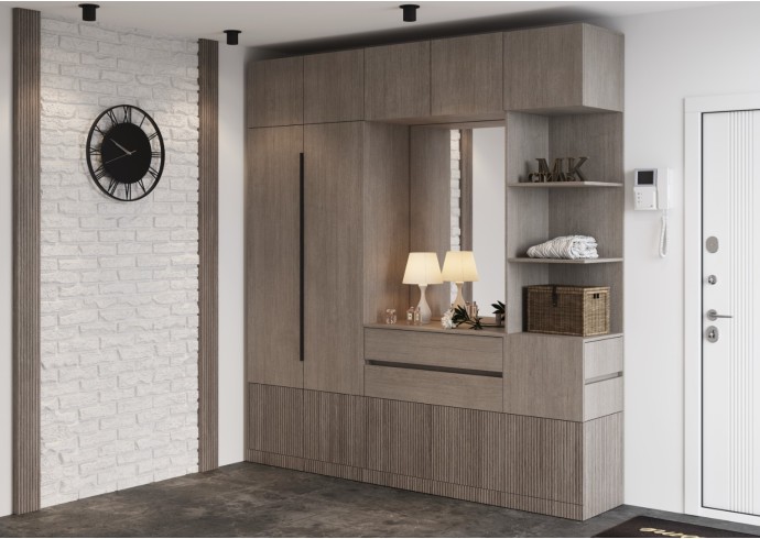 - Фасады с механизмом открывания при нажатии: Верхние и нижние фасады прихожей открываются легким нажатием, что делает использование комфортным и без лишних усилий.