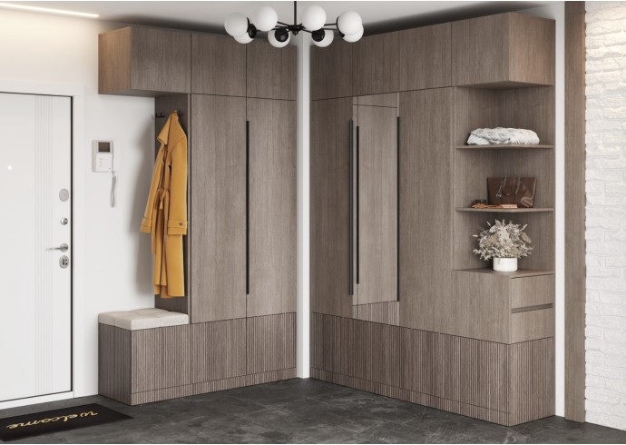 - Фасады с механизмом открывания при нажатии: Верхние и нижние фасады прихожей открываются легким нажатием, что делает использование комфортным и без лишних усилий.