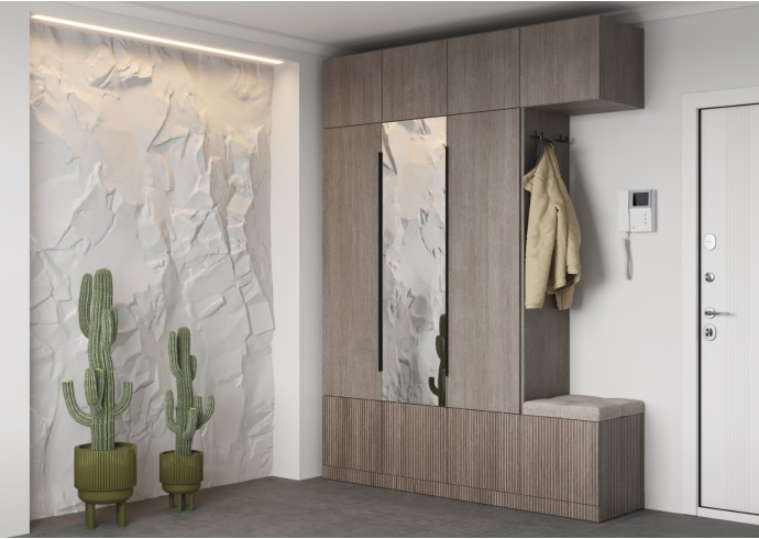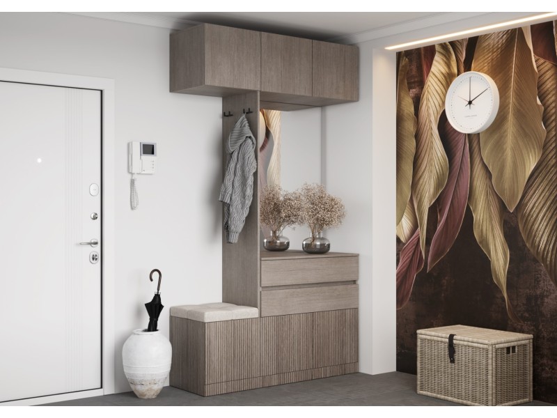 - Фасады с механизмом открывания при нажатии: Верхние и нижние фасады прихожей открываются легким нажатием, что делает использование комфортным и без лишних усилий.