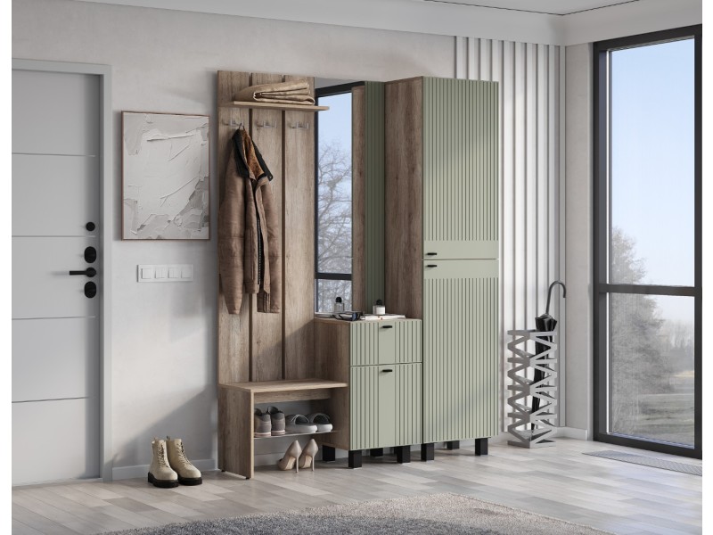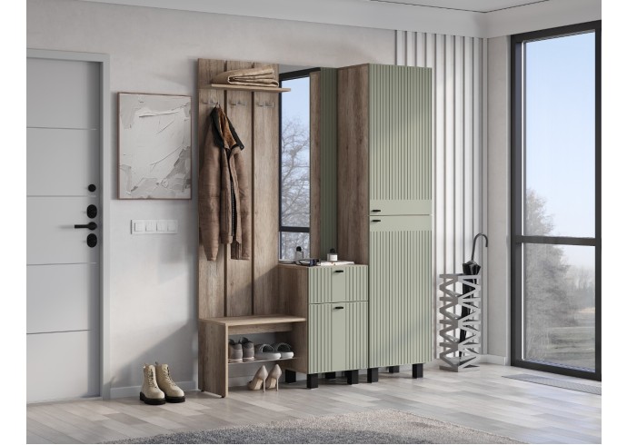 "Олива" - это элегантное и функциональное решение для любого интерьера. Коллекция представлена в трендовых пудровых оттенках. Фрезеровка на фасадах создает интересные текстурные контрасты и визуальные акценты. Кроме того, этот элемент декора также помогает скрыть мелкие загрязнения, что упрощает уход за мебелью. Черные металлические накладные ручки и петли с доводчиками обеспечивают удобство в использовании.