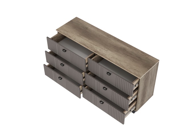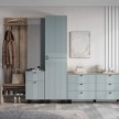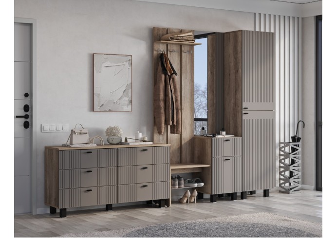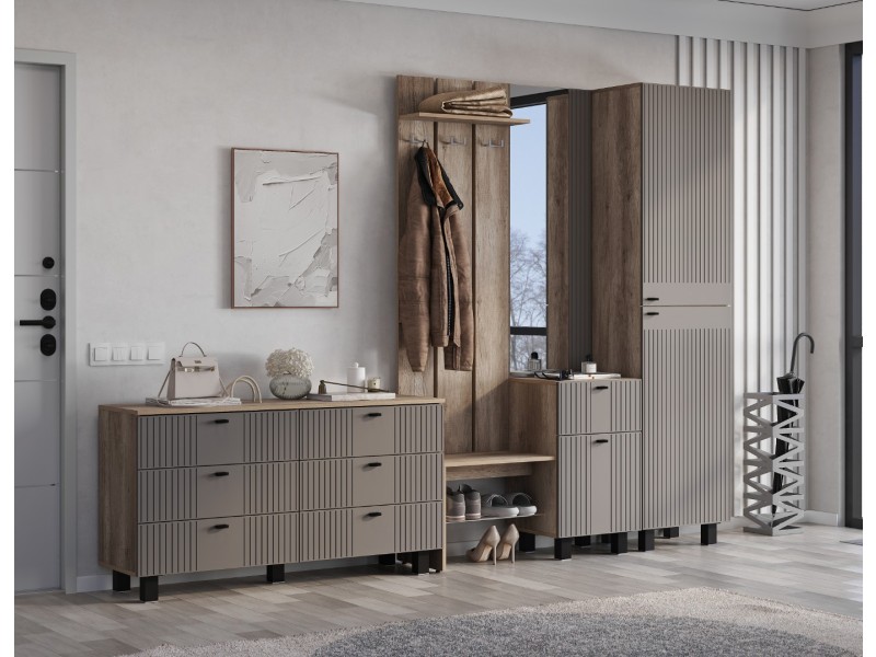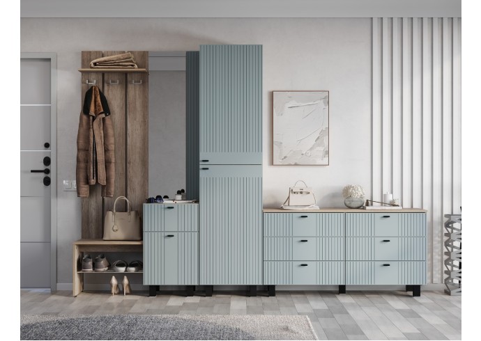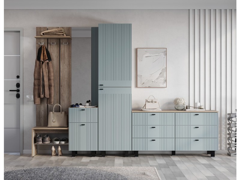 "Олива" - это элегантное и функциональное решение для любого интерьера. Коллекция представлена в трендовых пудровых оттенках. Фрезеровка на фасадах создает интересные текстурные контрасты и визуальные акценты. Кроме того, этот элемент декора также помогает скрыть мелкие загрязнения, что упрощает уход за мебелью. Черные металлические накладные ручки и петли с доводчиками обеспечивают удобство в использовании.