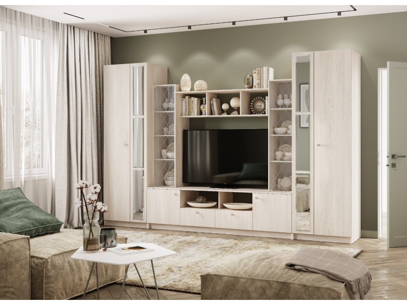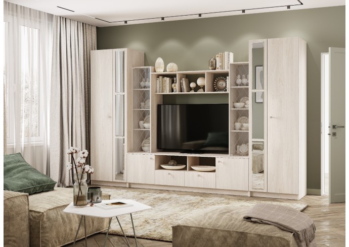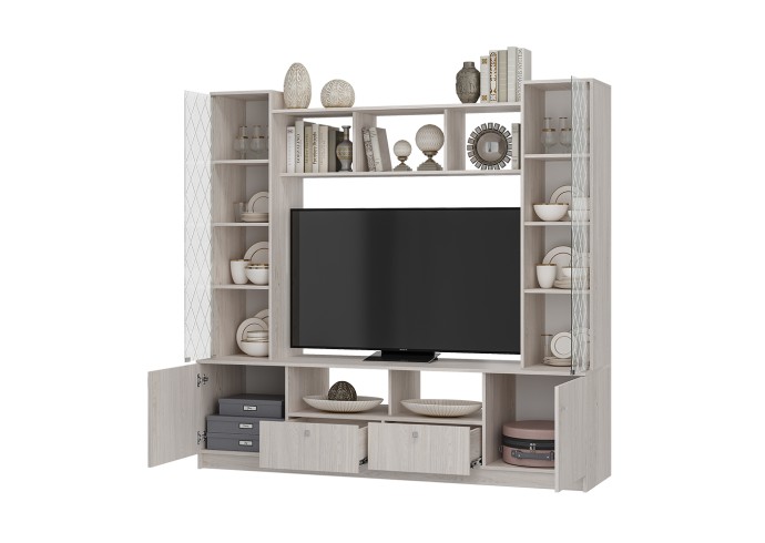Модульная функциональная гостиная «Зарина», выполненная в классическом стиле, станет приятным акцентом в интерьере вашей квартиры. Спокойная древесная фактура цвета "ясень белый" делают модель изысканной и стильной. Стеклянные створки по бокам просторной зоны под ТВ придают визуальный эффект лёгкости и невесомости, подчеркивая изысканный вкус обладателя гостиной. Благодаря выбранному цвету пыли и грязи на ней совершенно незаметно, а это огромный плюс для домохозяек!