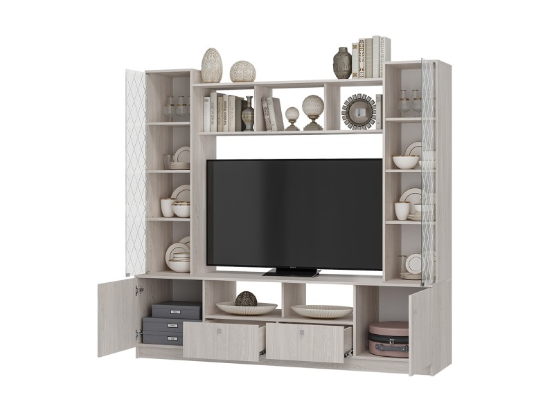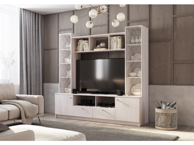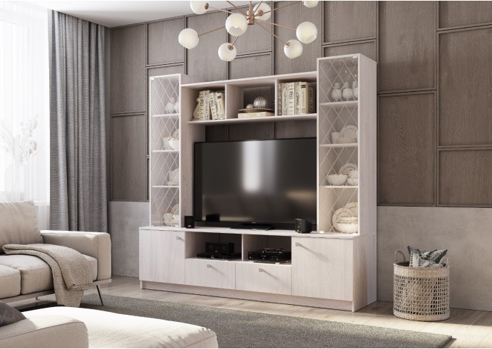Модульная функциональная гостиная «Зарина», выполненная в классическом стиле, станет приятным акцентом в интерьере вашей квартиры. Спокойная древесная фактура цвета "ясень белый" делают модель изысканной и стильной. Стеклянные створки по бокам просторной зоны под ТВ придают визуальный эффект лёгкости и невесомости, подчеркивая изысканный вкус обладателя гостиной. Благодаря выбранному цвету пыли и грязи на ней совершенно незаметно, а это огромный плюс для домохозяек!