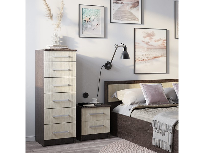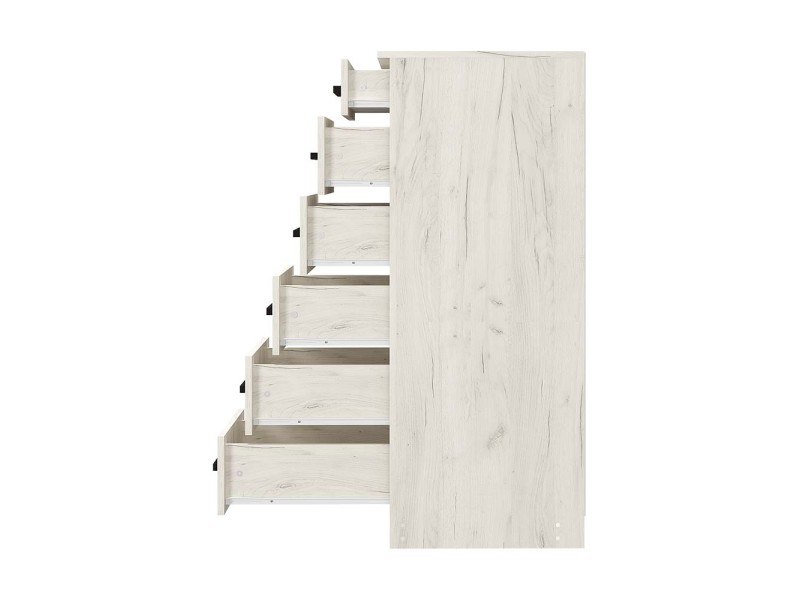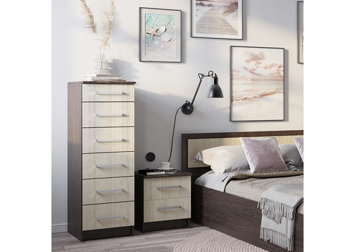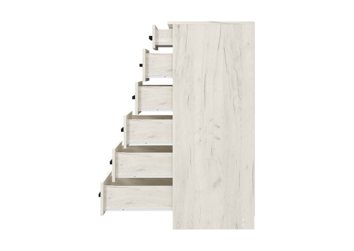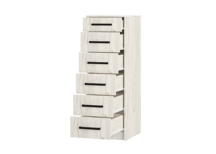 Невероятно практичная и функциональная модель комода "Фиеста" отлично впишется в любую комнату от коридора до спальни. Компактный размер изделия вместит в себя большое количество вещей за счет шести выдвижных ящиков. Верхнее отделение меньше остальных и прекрасно подходит для хранения мелочей.