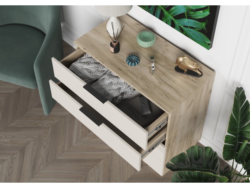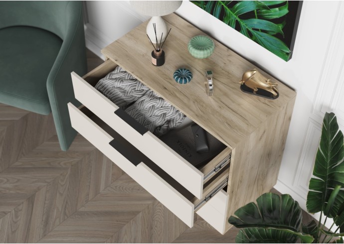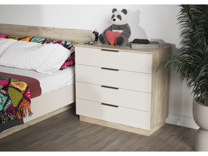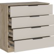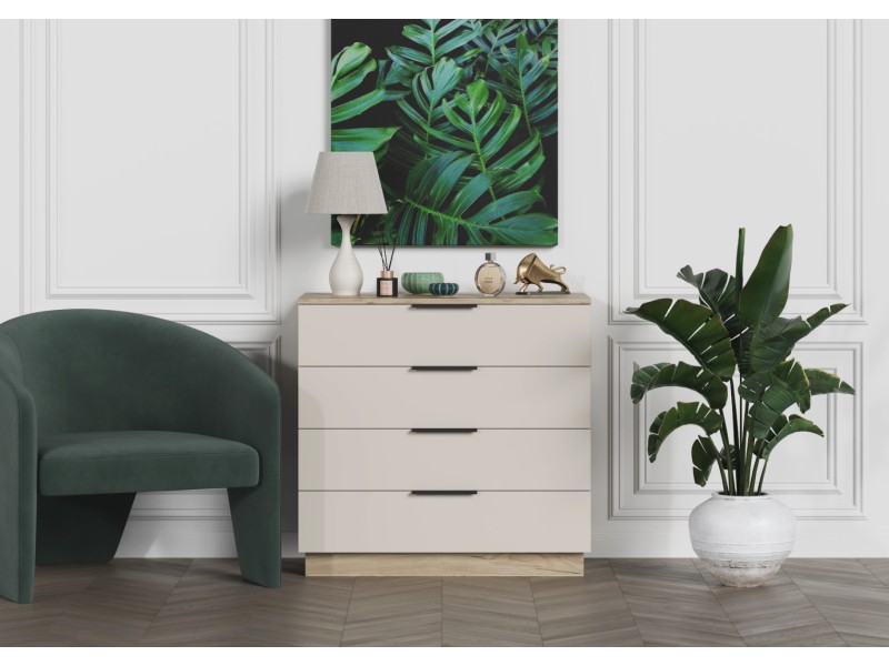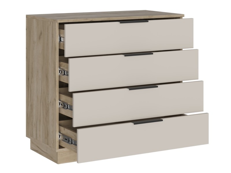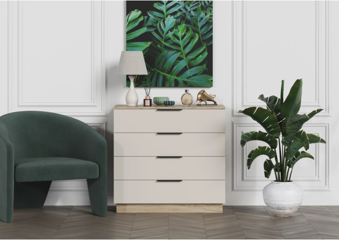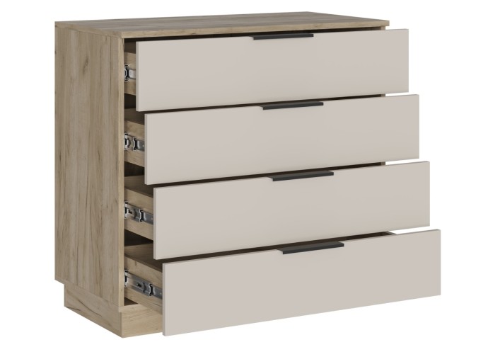- Минималистичные ручки: Открытие ящиков осуществляется с помощью стильных и удобных ручек-профилей в черном матовом цвете, которые подчеркивают современный характер комода.