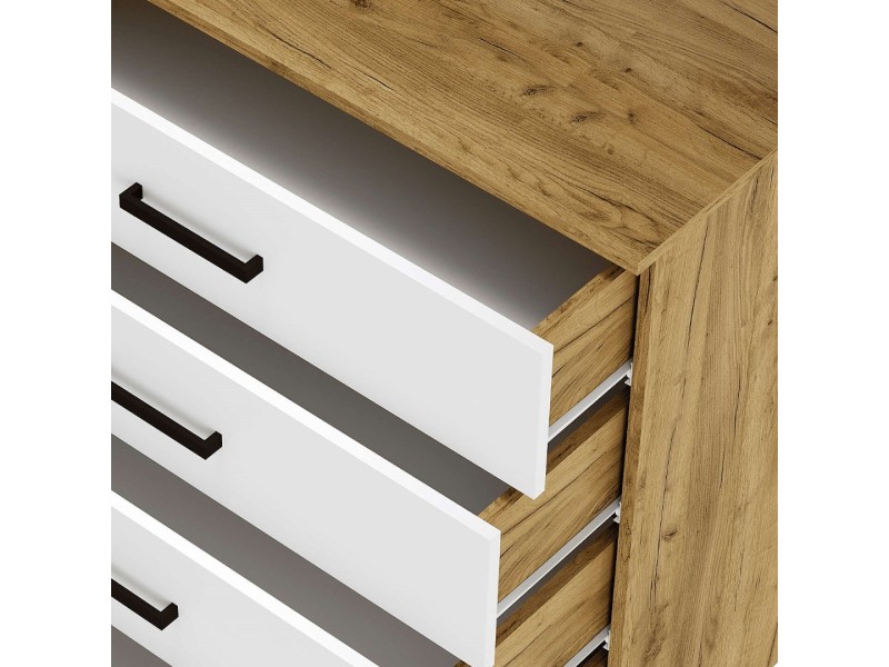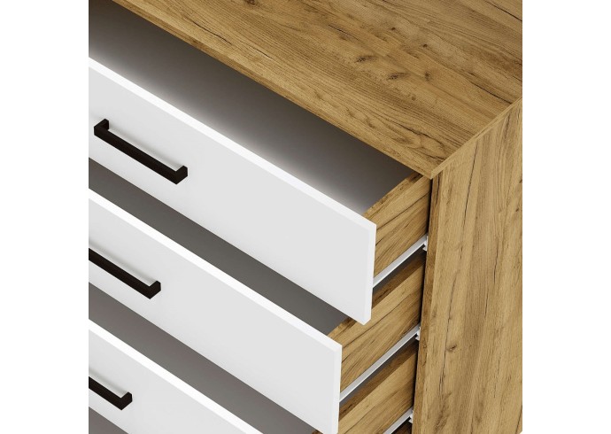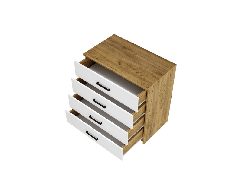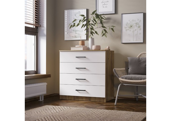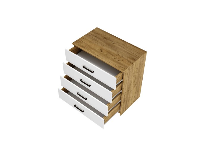 Комод в приятных и легких оттенках "крафт" и "белый" – это эстетичное и функциональное дополнение для вашей спальни или гостиной. Модель создана из высококачественного ЛДСП. Комод состоит из четырех вместительных ящиков с эргономичными стильными ручками.