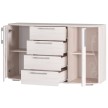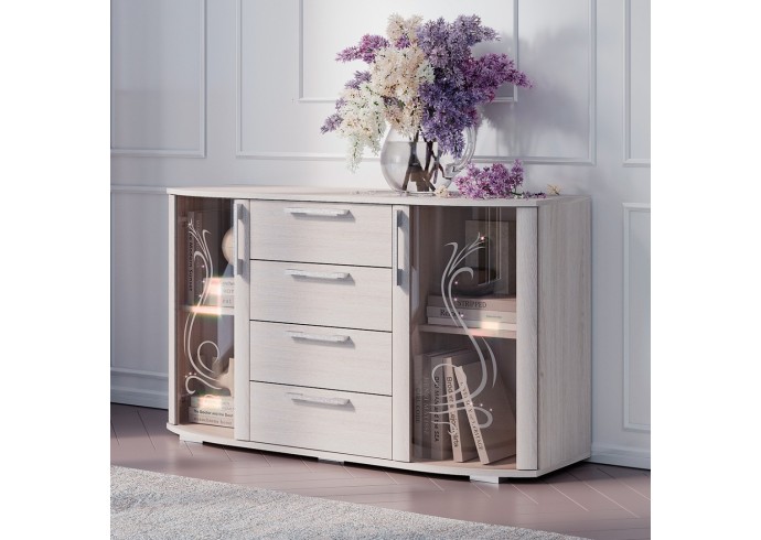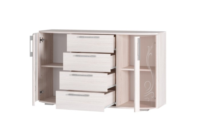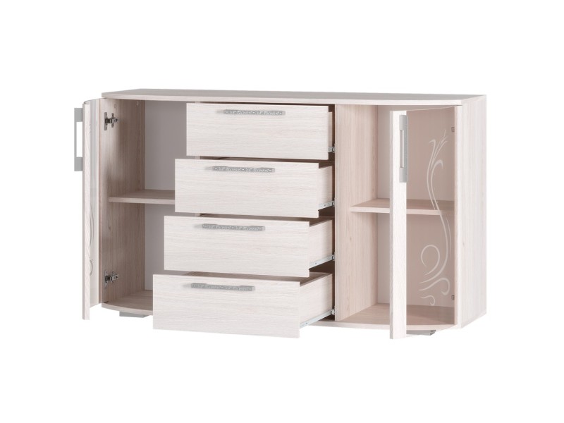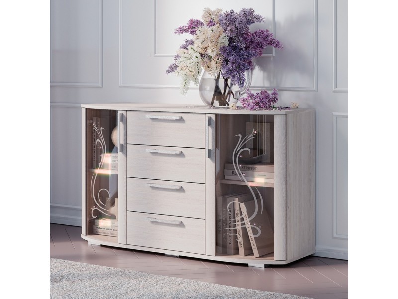 Комод «Флорида» - современный стильный комод, который займёт достойное место как в спальной комнате, так и в гостиной Вашего дома. Фасад модели представляет собой прекрасный тандем стеклянных и деревянных элементов. Светлый цвет корпуса и фасада в комбинации с прозрачными стеклостворками делают модель лёгкой, визуально увеличивая пространство комнаты. Вместительные глубокие ящики на роликовых направляющих обеспечивают легкую, бесшумную и долговечную эксплуатацию моделей. На просторной столешнице комода можно разместить телевизор, элементы декора или домашние растения.