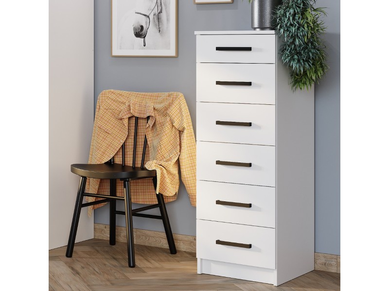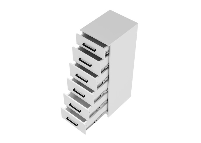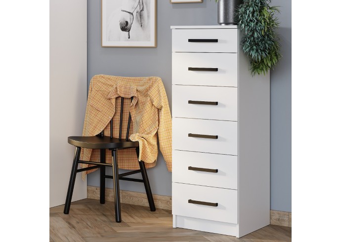 Комод «Фьюжн» КМ-04 – это современное решение для вашего интерьера. Модель оснащена шестью вместительными ящиками, в которых можно хранить белье, аксессуары, книги и важные мелочи. Узкая вертикальная конструкция позволяет сэкономить пространство.