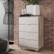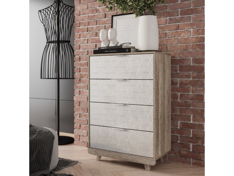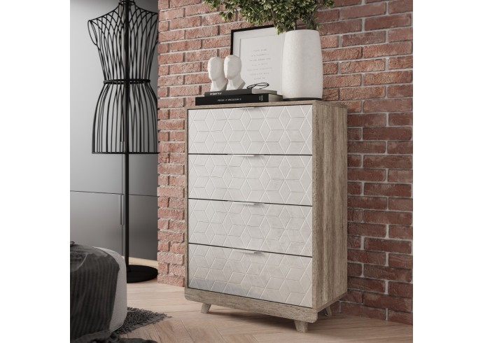 Особый шарм комодам «Мегаполис» придают трендовые цветовые решения фасадов, которые идеально вписываются практически в любой стиль. Оригинальная фрезеровка и эксклюзивная фотопечать выглядит очень эффектно и эксклюзивно. Пыли и грязи на таких поверхностях совершенно не видно, а это огромный плюс для домохозяек! Комод (КМ-02) состоит из четырёх выдвижных ящиков на шариковых направляющих для хранения одежды, пастельного белья и других хозяйственных аксессуаров. Цветовая палитра фасадов комодов впервые разбавлена фасадами с качественной фотопечатью.
