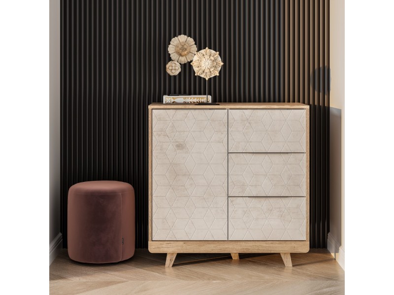 Особый шарм комодам «Мегаполис» придают трендовые цветовые решения фасадов, которые идеально вписываются практически в любой стиль. Оригинальная фрезеровка и эксклюзивная фотопечать выглядит очень эффектно и эксклюзивно. Пыли и грязи на таких поверхностях совершенно не видно, а это огромный плюс для домохозяек! Комод (КМ-12) выдержан в общей стилистике «Мегаполис» и состоит из одного распашного и трёх выдвижных ящиков на шариковых направляющих с удобной системой хранения. Полезное пространство распашного ящика разделено полкой.