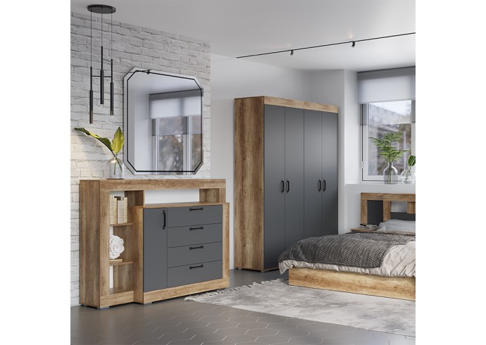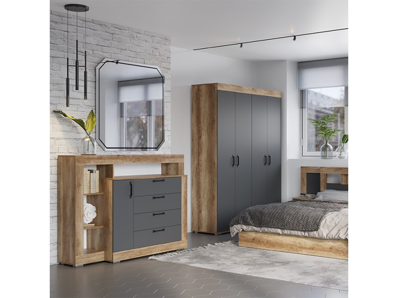 Коллекция "Прима" в модном декоре "дуб каньон/графит" удачно вписывается в городской индустриальный стиль и выглядит очень необычно и оригинально. Приятный корпус под дерево и матовые тёмные фасады - такое контрастное сочетание добавит комнате стиля.
