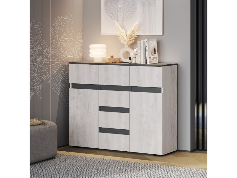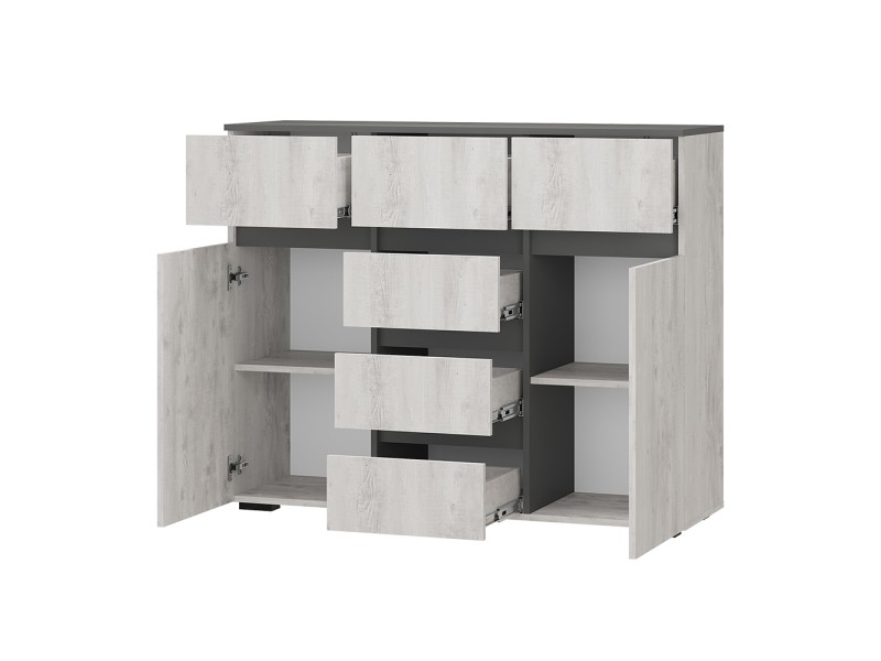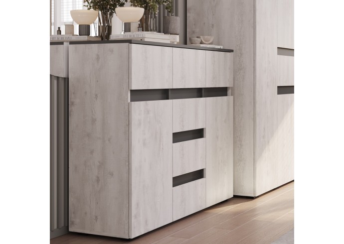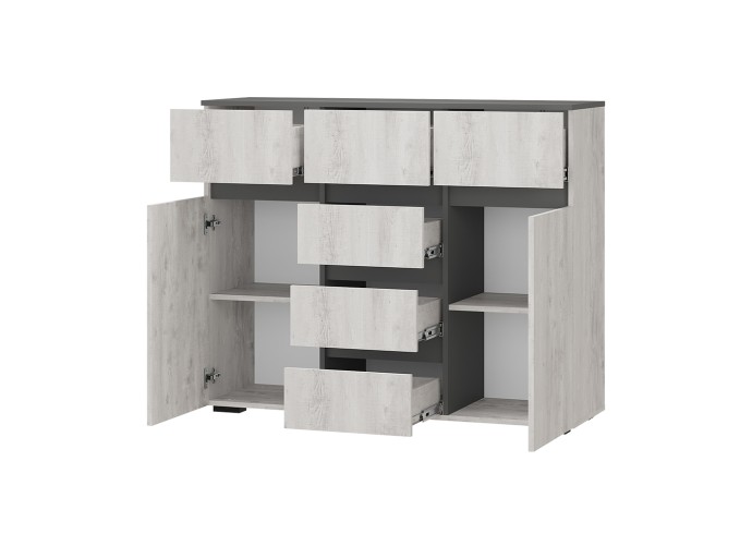 Коллекция «Мрия» — это органичное сочетание классических и современных элементов в дизайне мебели. Оттенки «бетон пайн светлый» и «графит» создают красивый контраст, который привнесет гармонию в интерьер. Однотонные горизонтальные геометрические вставки придают многослойность коллекции.