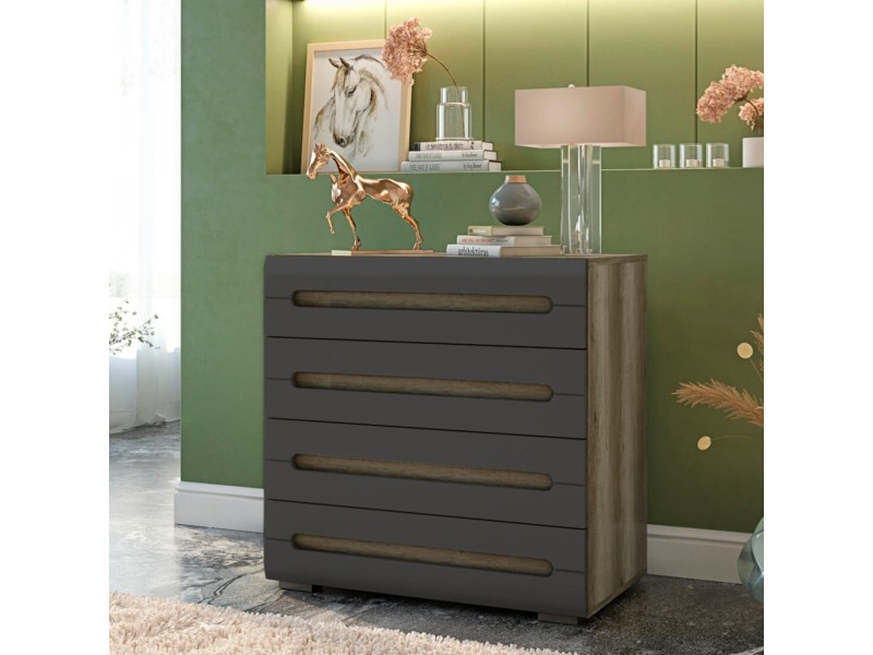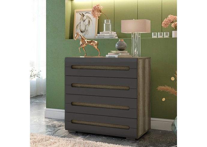 Комод "Наоми" – отличный выбор! Он украсит собой любую комнату за счет стильного дизайна. В данной модели нет стандартных ручек, они встроены в фасады выдвижных ящиков. В дизайне комода сочетаются цвета серый и "дуб каньон", поэтому он прекрасно подойдет для современного интерьера.