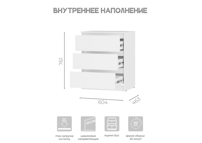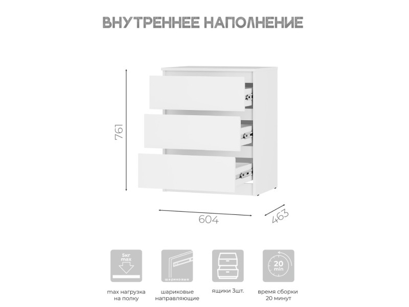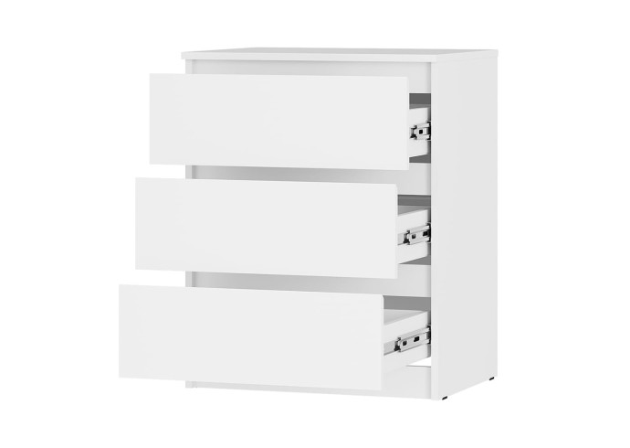 Комод «Симпл» (КМ-01) — компактный и вместительный комод с тремя выдвижными ящиками, которые открываются бесшумно за счет шариковых направляющих. Идеальная модель для хранения постельного белья и легкой одежды, а также различных мелочей. На столешнице можно разместить торшер, книги и косметику.