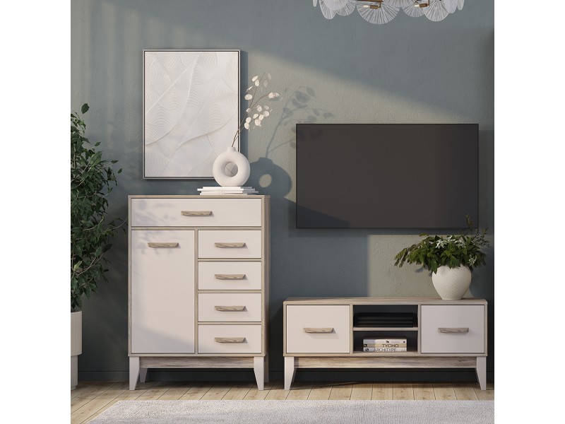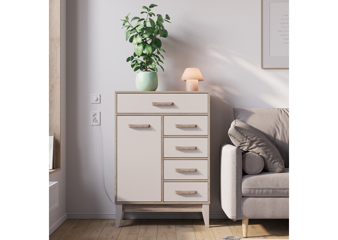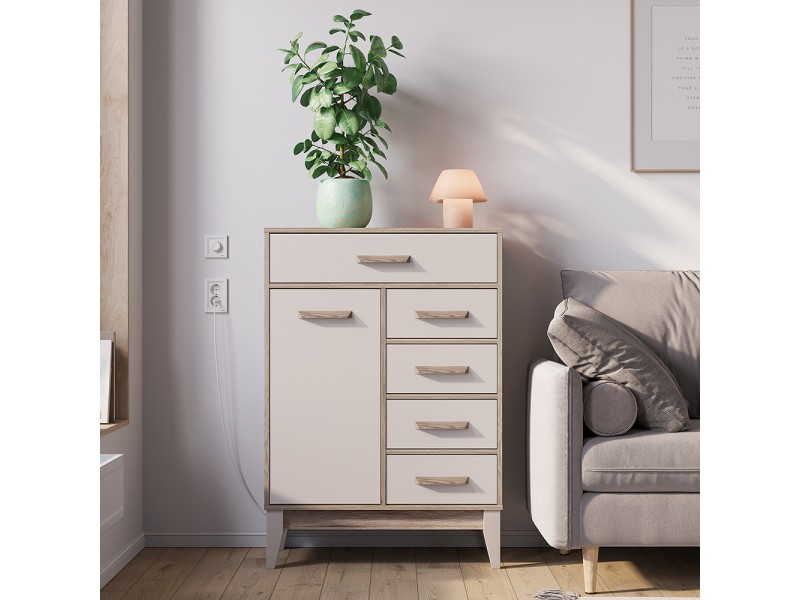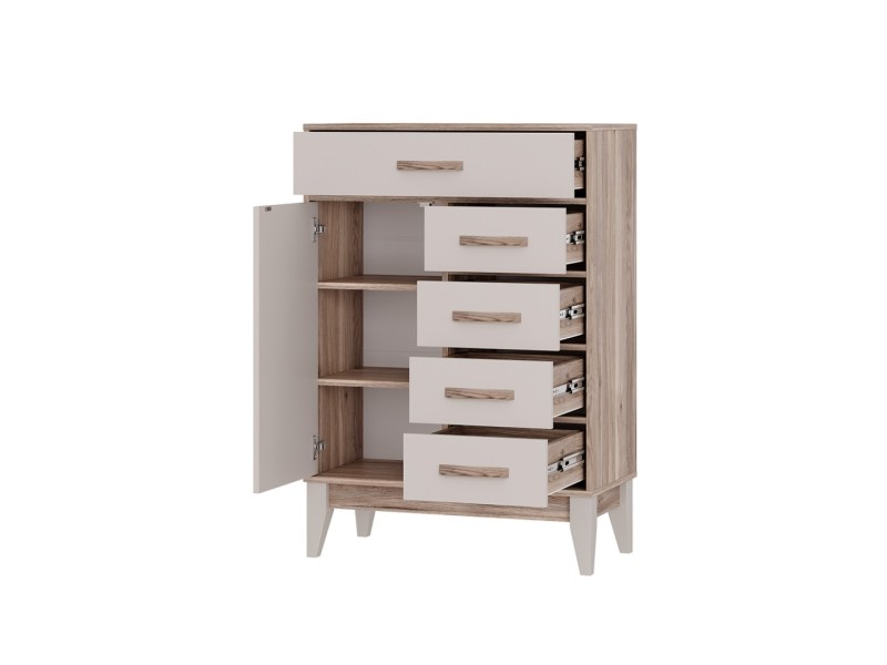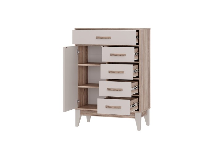 Комод «Скандика» – это компактная, но вместительная модель для гостиной или спальни. Благодаря вытянутой форме комод можно разместить на небольшом пространстве – например, возле дивана. Комод укомплектован четырьмя ящиками и отсеком с дверцей. В этой модели можно организовать несколько зон хранения, в ней поместятся и мелочи для рукоделия, и документы, и одежда.