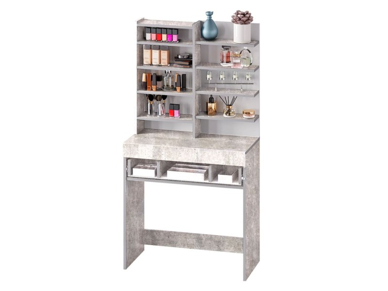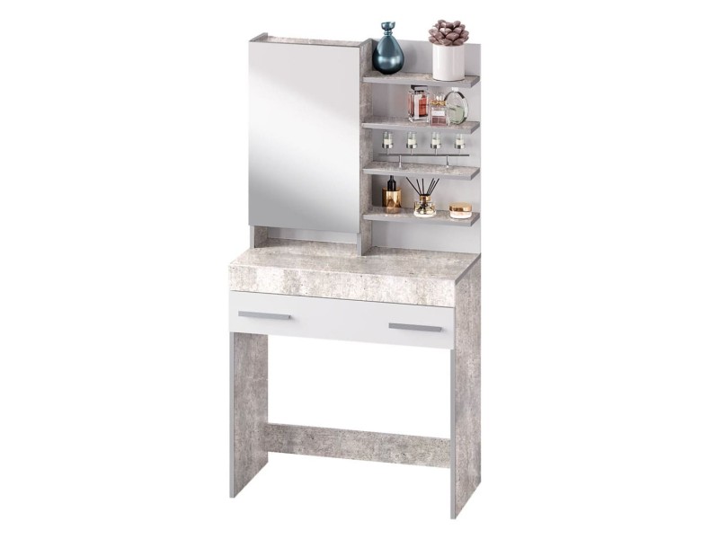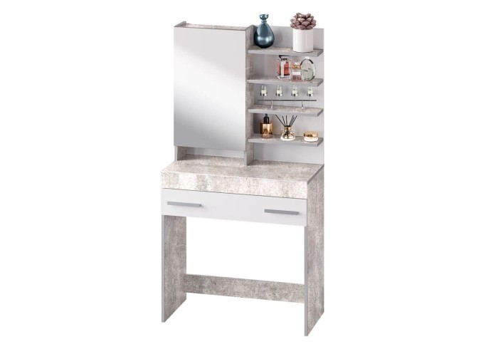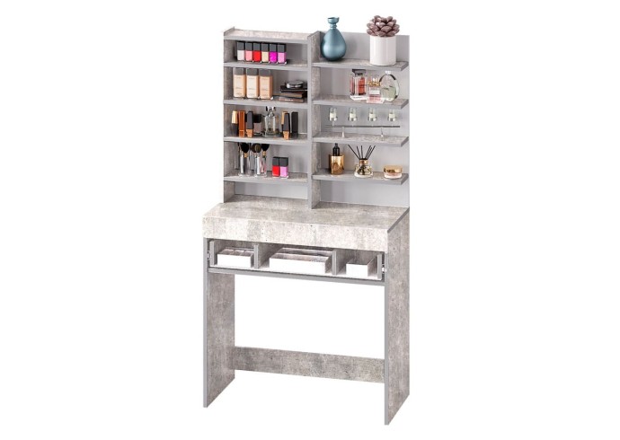 Косметический стол из мебельной коллекции "Инстайл" – незаменимый атрибут для любой женщины! Разместить все необходимые бьюти-гаджеты, средства для ухода за лицом и волосами можно в данной модели. В столешницу встроен выдвижной ящик с отделениями для хранения различных мелочей или украшений. Туалетный столик обладает большим количеством полок, часть из которых спрятаны за зеркальной дверцей, а часть является открытыми, чтобы предметы первой необходимости всегда были под рукой! Гармоничное сочетание белого и серого цвета позволит косметическому столу украсить любой интерьер.