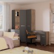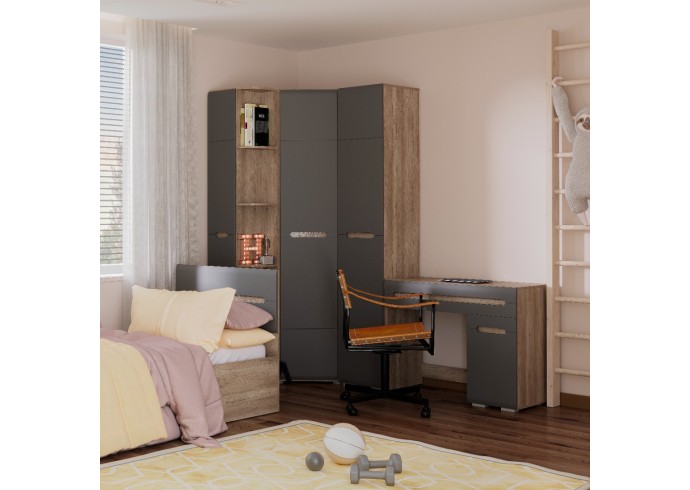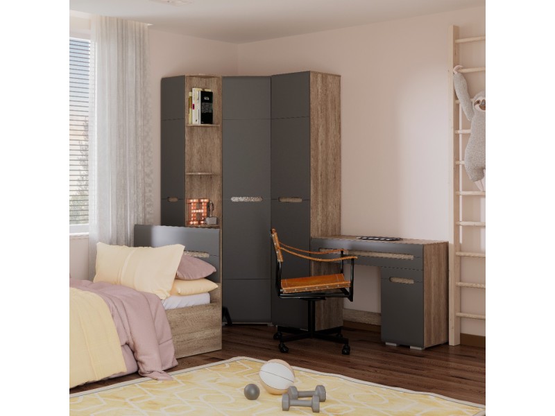 Модульная коллекция «Наоми» – это стильное современное решение в контрастном сочетании корпуса «дуб каньон» с элегантным матовым фасадом насыщенного грифельного оттенка. Оригинальное конструктивное решение коллекции – ручки фасадов, выполненные путем сложной фрезеровки с максимально реалистичным декором дубового спила.
