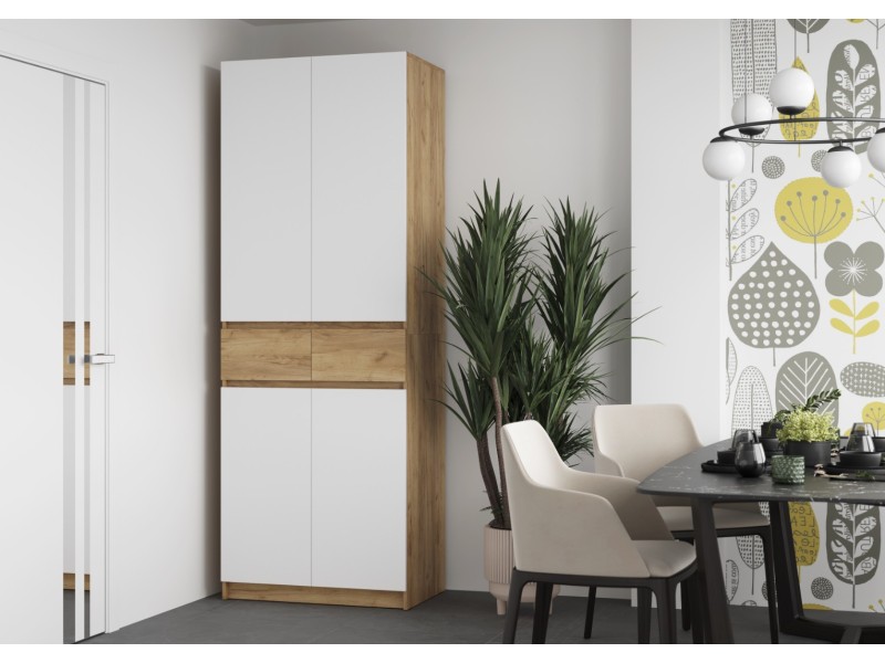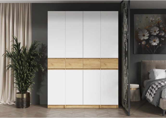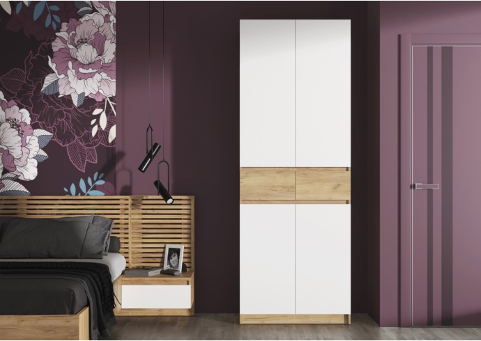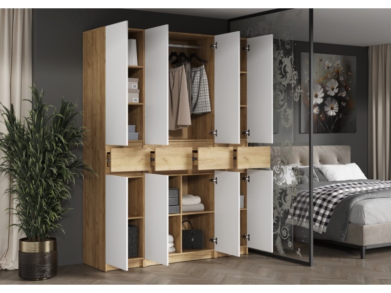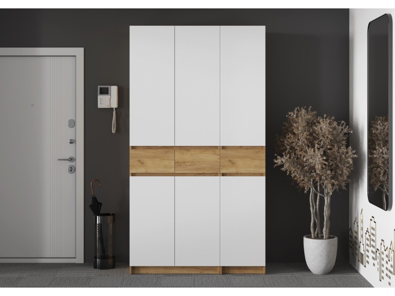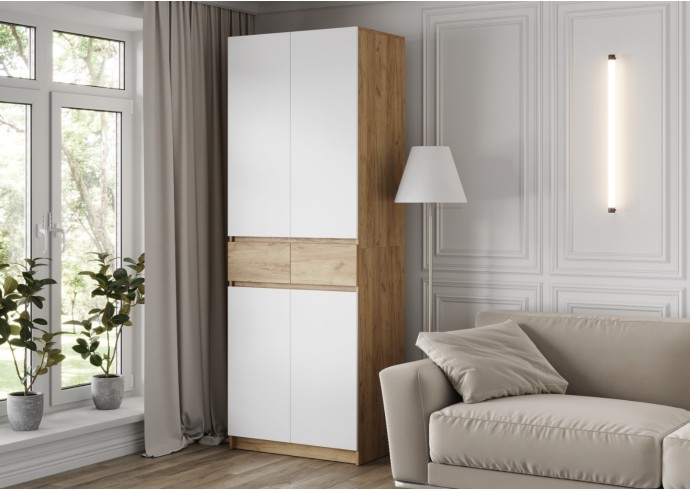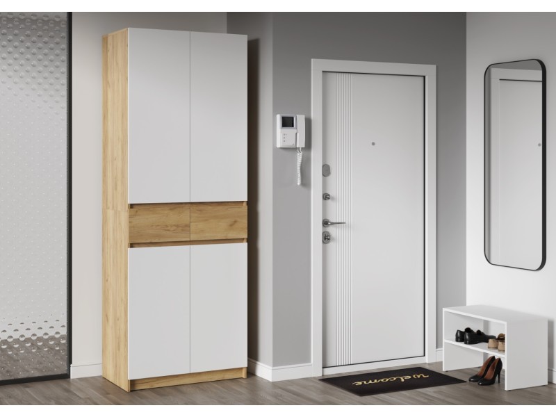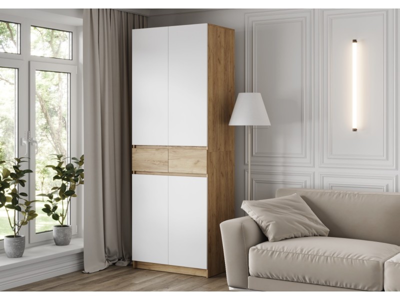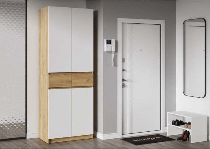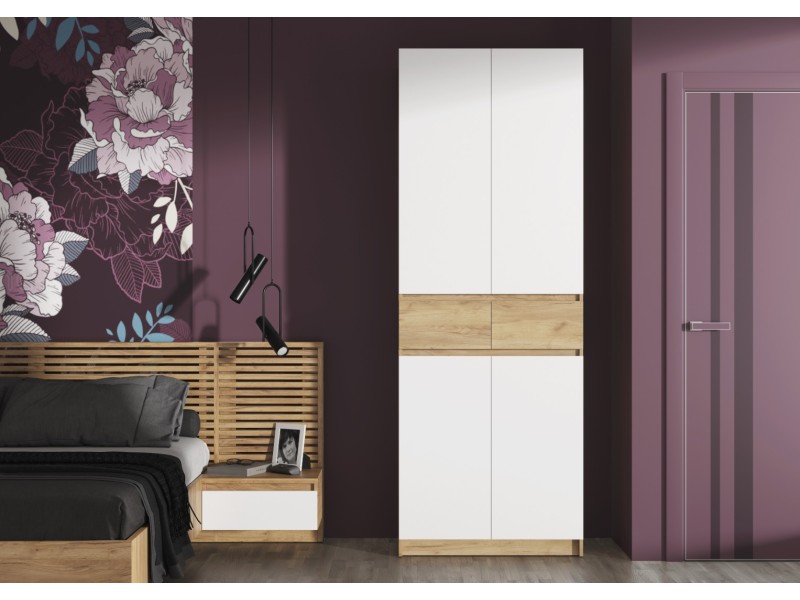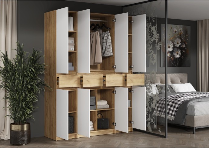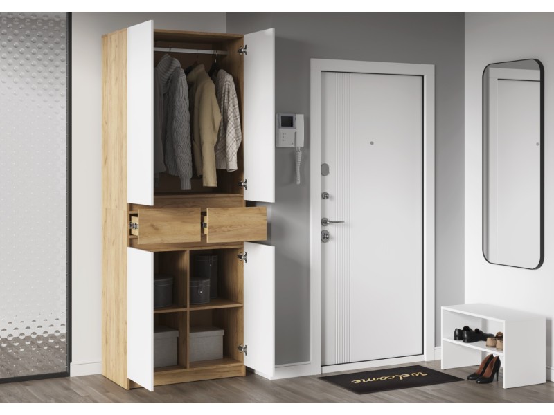 Этот двухстворчатый шкаф КВИК-СТЕП ШК-001 станет элегантным и функциональным дополнением к любому современному интерьеру. Сочетание деревянной текстуры и белых фасадов позволяет ему гармонично вписаться в различные стили, такие как скандинавский, минимализм и лофт.