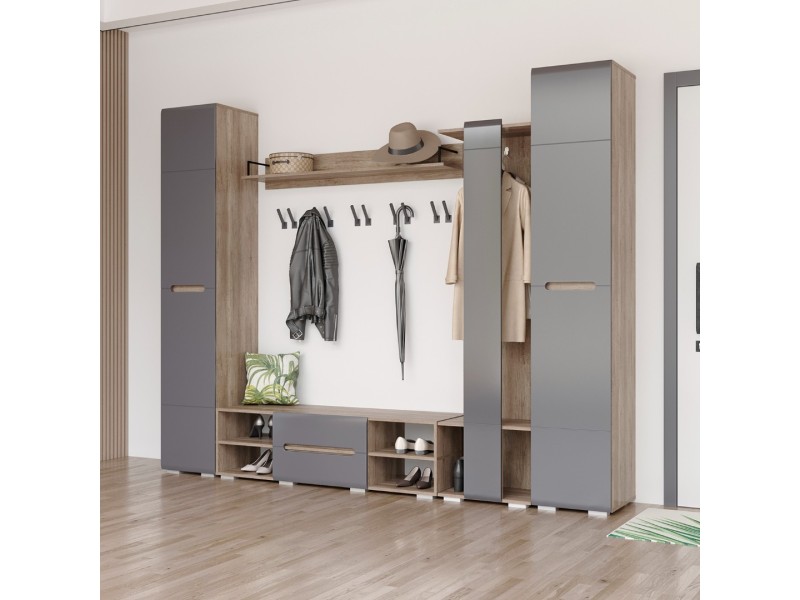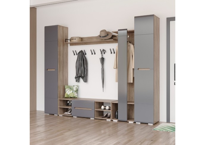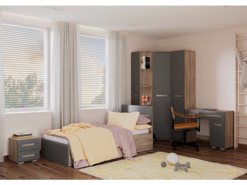 Модульная коллекция «Наоми» – это стильное современное решение в контрастном сочетании корпуса «дуб каньон» с элегантным матовым фасадом насыщенного грифельного оттенка. Оригинальное конструктивное решение коллекции – ручки фасадов, выполненные путем сложной фрезеровки с максимально реалистичным декором дубового спила.