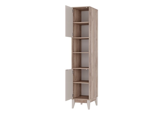 Стильный и функциональный пенал «Скандика» - незаменимый предмет мебели в гостиной, спальне или детской комнате. Модель состоит из четырех полок, скрытых за дверцами, и двух открытых полок, на которых можно разместить книги, документы, предметы декора, игрушки и одежду. Ручки повторяют текстуру корпуса «дуб смоки». Высокие эмалированные деревянные опоры из бука (200 мм) создают иллюзию большего пространства в комнате и вносят ощущение легкости в интерьер.