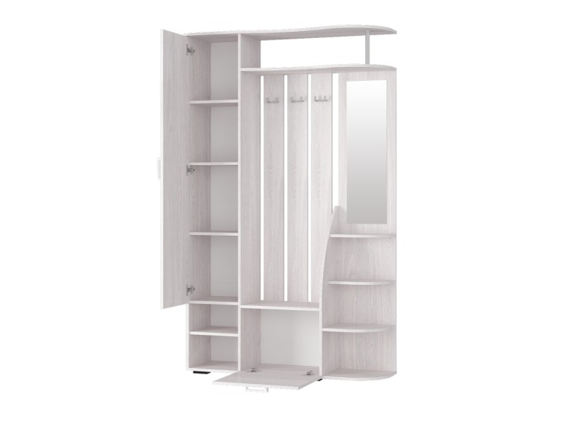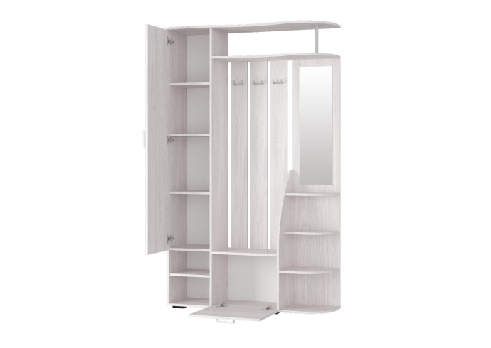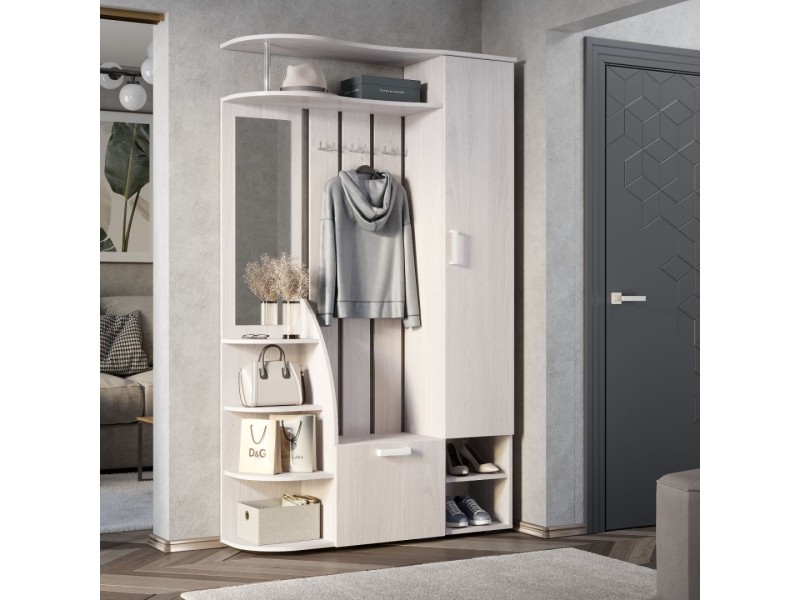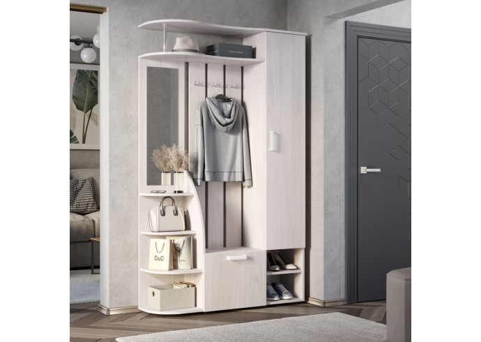 Прихожая «Анора» – это модель, выполненная в нежном оттенке «ясень белый». Лаконичный дизайн с мягкими линиями делает её идеальным решением для современного дома. Белоснежные ручки на дверцах легко ложатся в руку и облегчают ежедневное использование прихожей. В «Анора» предусмотрены все нужные зоны для хранения: боковые открытые полки для повседневной обуви, закрытый ящик для сезонной, а также полки для головных уборов и шкаф для верхней одежды.