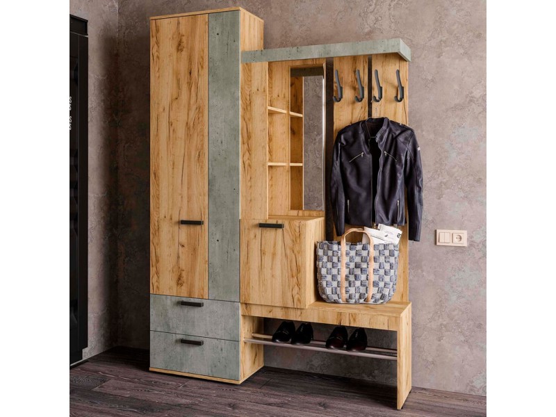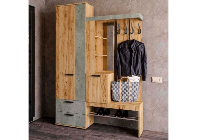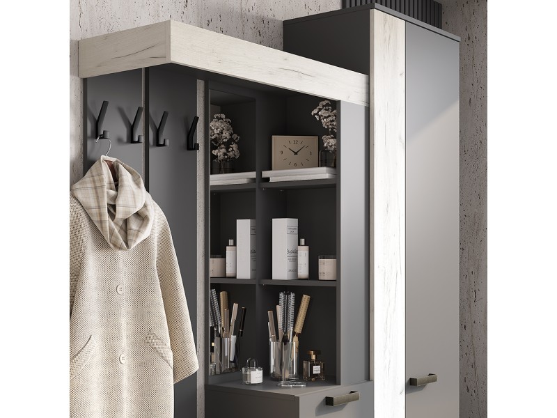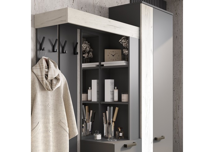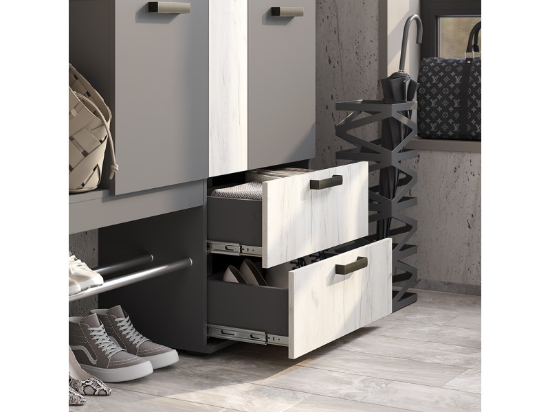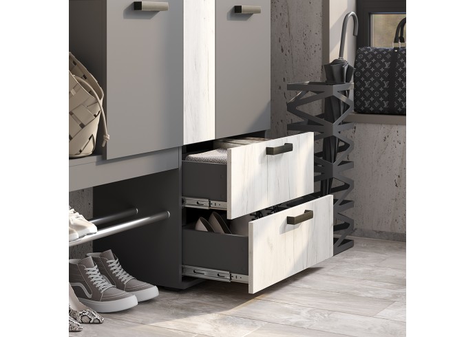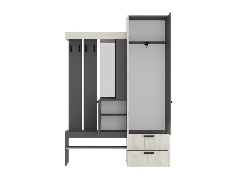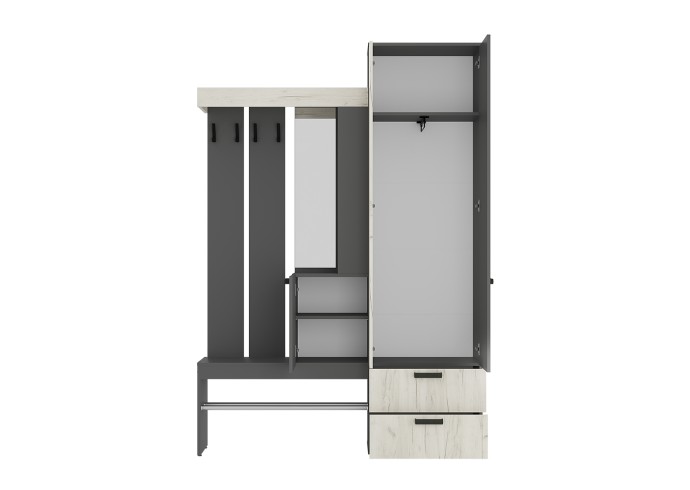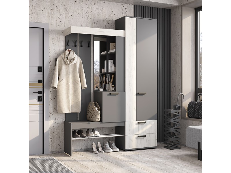 Изящная и практичная конструкция. Вместительный и компактный шкаф с отделением для верхней одежды и выдвижными ящиками. Удобная подставка под обувь (металлическая труба). Эргономичная основная секция с крючками для одежды, полками для мелочей, зеркалом и одним закрытым отделением. Контрастное исполнение в трендовых оттенках.