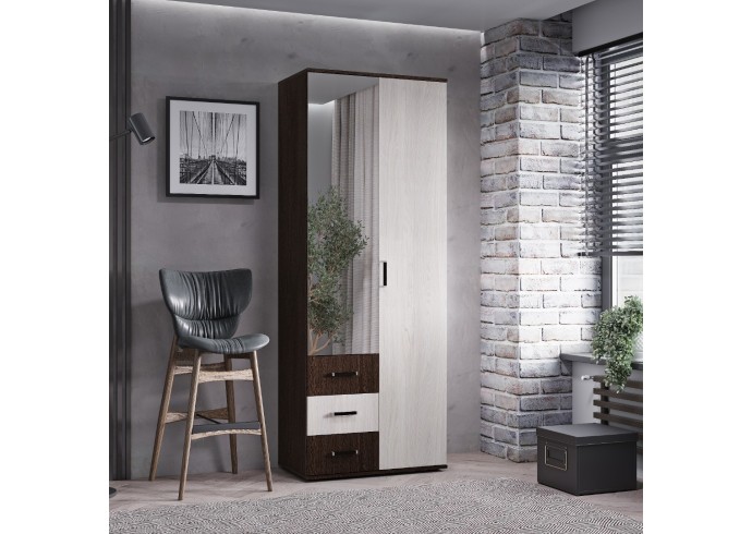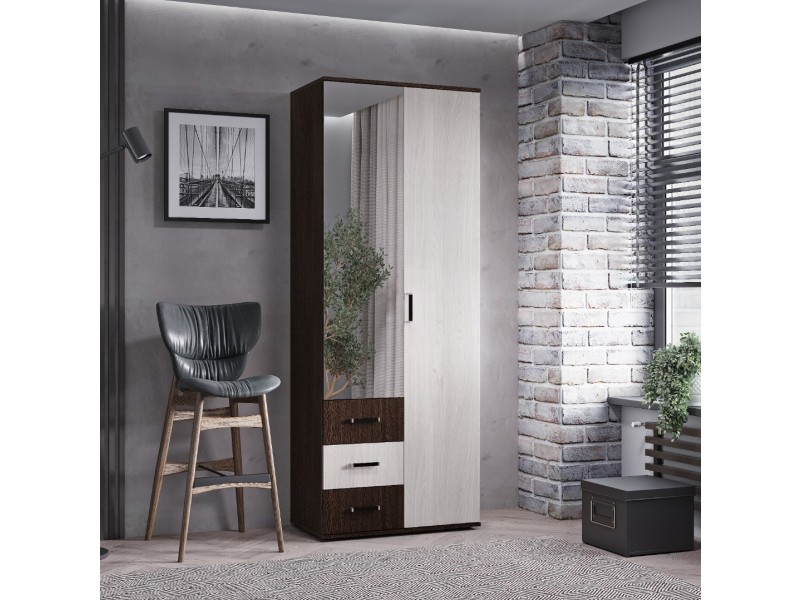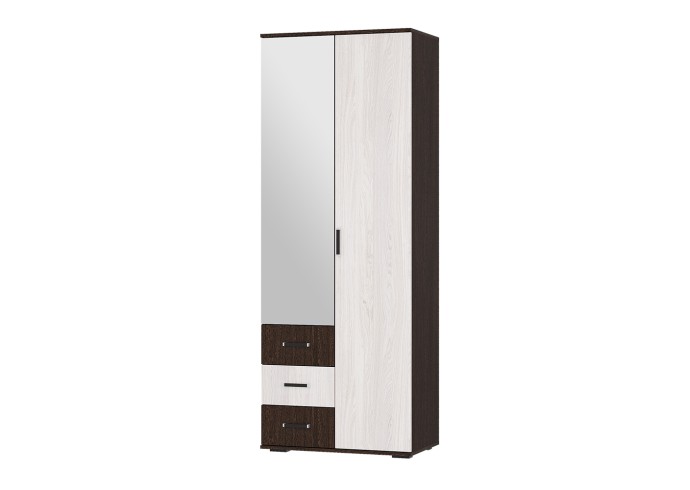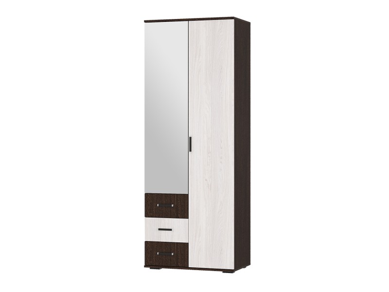 Двустворчатый шкаф "Белла" станет незаменимым помощником в хранении ваших вещей. Модель имеет отделение с хромированной штангой для одежды на вешалках, три выдвижных ящика для белья и аксессуаров, а также верхнюю полку. На один из фасадов прикреплено высокое зеркало.