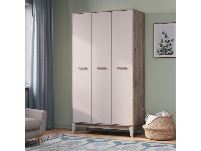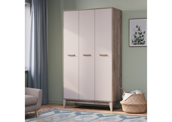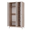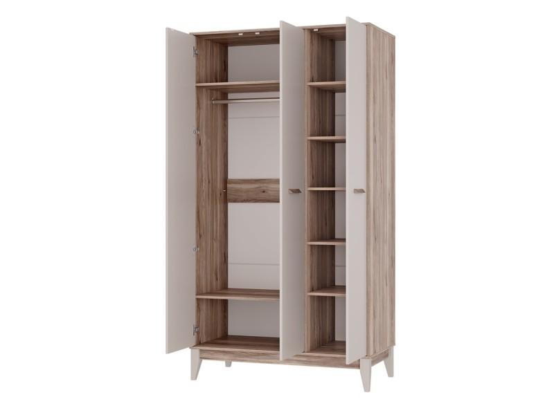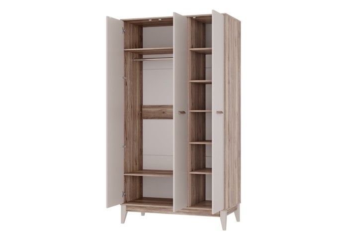 Трехстворчатый шкаф «Скандика» дополнит другие модули коллекции или впишется в готовый интерьер. Светлые оттенки и минималистичный дизайн делают эту модель универсальной. Шкаф «Скандика» станет удобным и комфортным пространством для ваших любимых вещей. За одной дверцей размещены две просторные открытые полки и секция с надежной хромированной штангой для вертикального хранения, а за другой – шесть открытых полок.