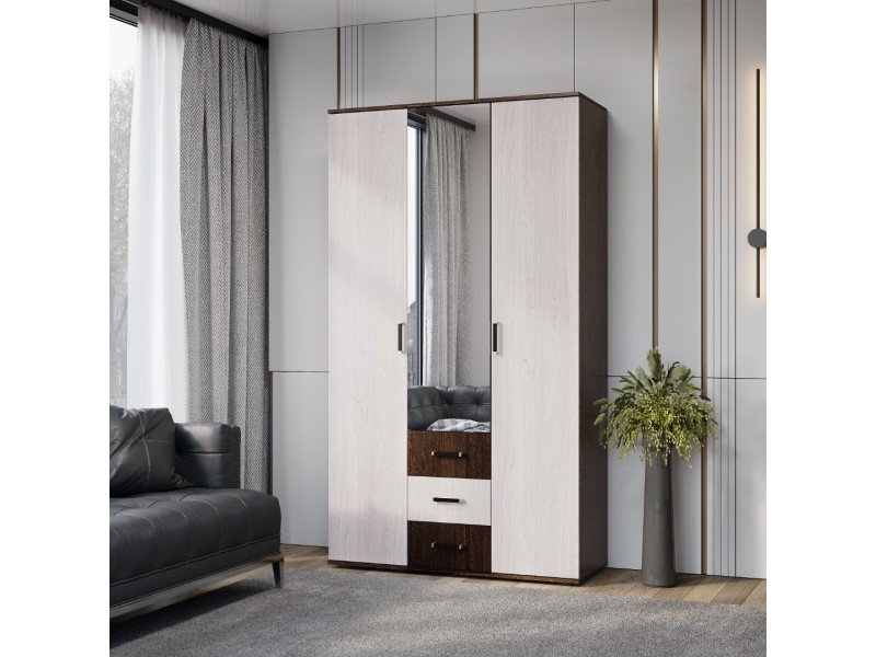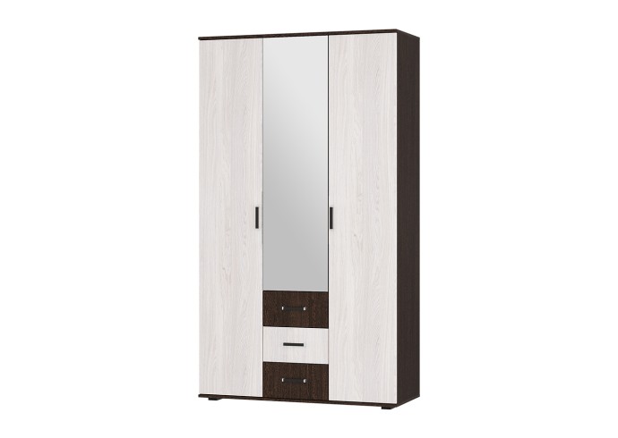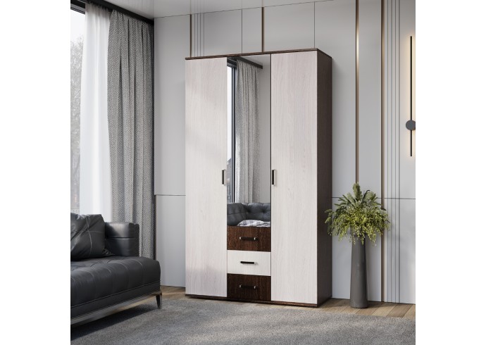 Трёхстворчатый шкаф "Белла" станет незаменимым помощником в хранении ваших вещей. Модель имеет отделение с хромированной штангой для одежды на вешалках, три выдвижных ящика, а также зону с полками. На центральный фасад прикреплено высокое зеркало.