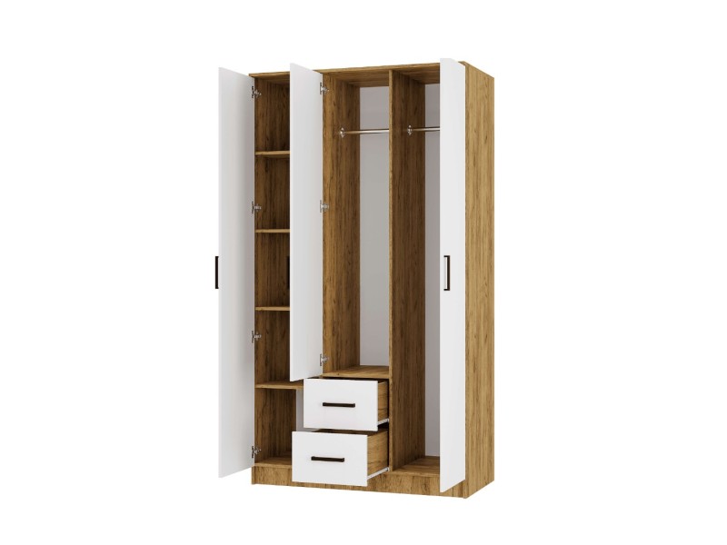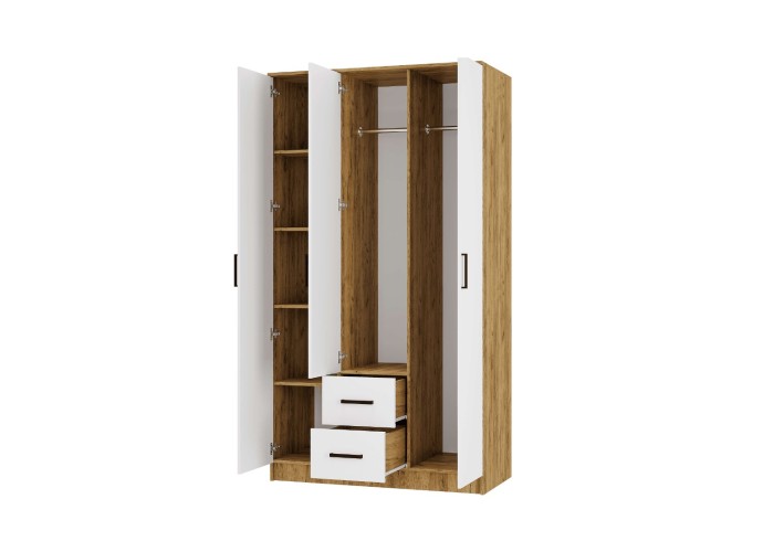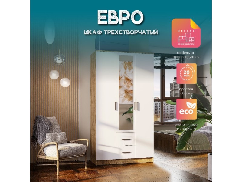 Шкаф трехстворчатый «Евро» ШК-06 - ваш стильный и удобный спутник в организации пространства. Он состоит из двух отделений со штангой, отделения с полками и двух выдвижных ящиков на роликовых направляющих.
