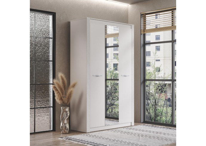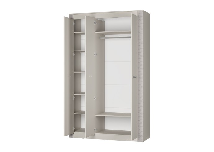 Трехстворчатый шкаф "Монако" относится к одноименной модульной серии. Модель не имеет вычурного декора и лишних деталей, выполнена в сдержанном и лаконичном стиле. Комплектация шкафа представляет собой несколько полок для хранения вещей в сложенном виде, а также отделение с хромированной штангой для одежды на вешалках. Для создания модели используется качественная ЛДСП цвета "кашемир". Центральная створка является полностью зеркальной, две остальные дополнены изящными ручками.