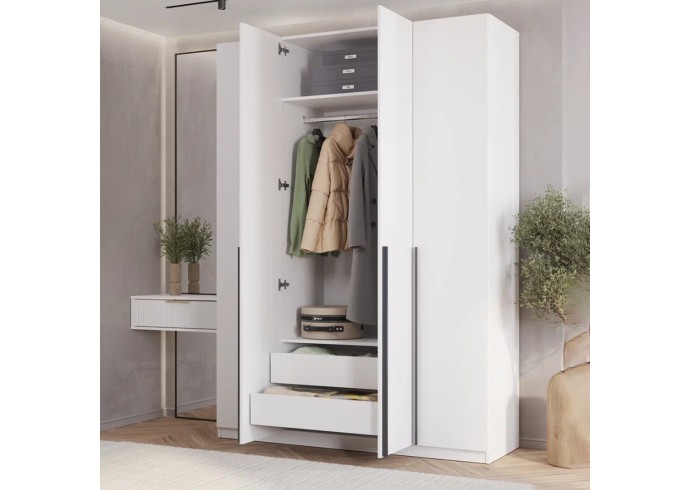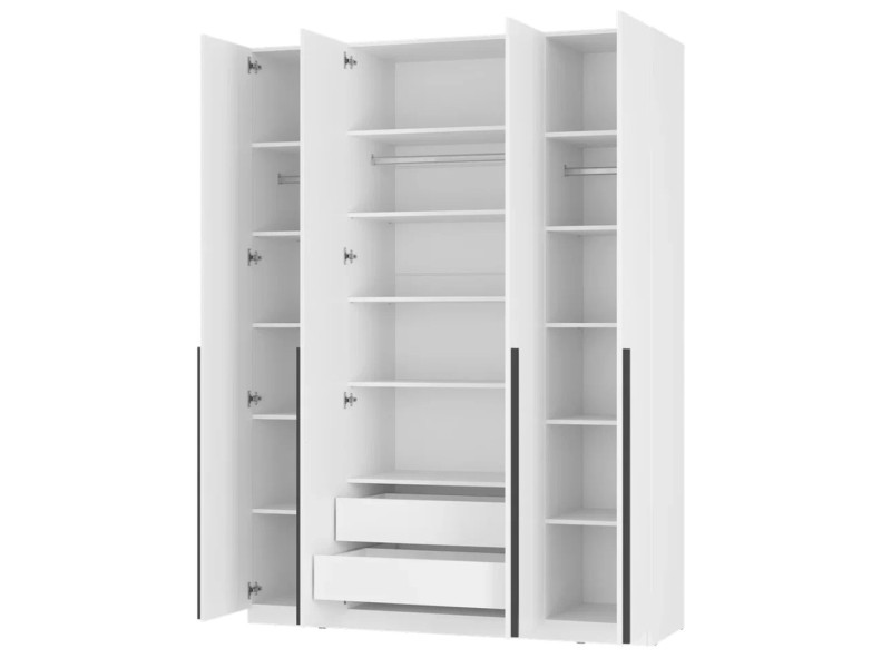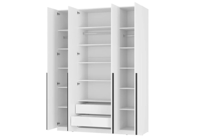 данная модель шкафа идёт в комплекте с 3 штангами. По желанию Вы можете дополнительно заказать полки и ящики.