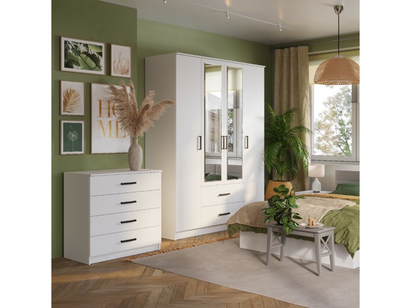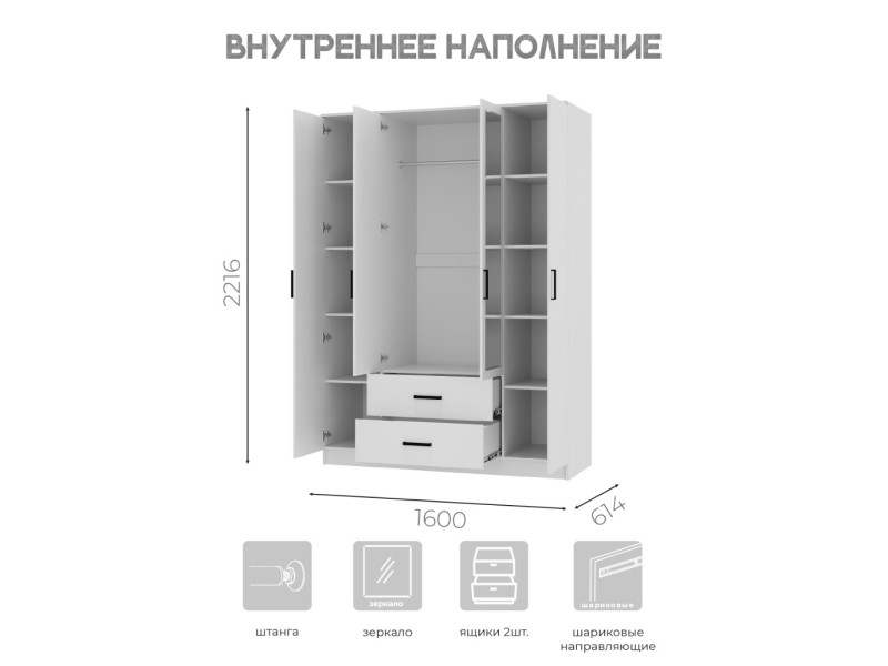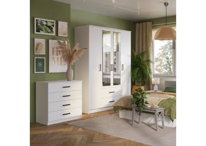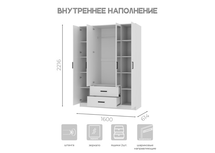 Четырехстворчатый шкаф «Фьюжн» – это настоящая находка для семьи, а также для обладателей большой коллекции одежды. Два крайних отсека идеально подойдут для хранения повседневной одежды, а центральная секция со штангой позволит аккуратно хранить верхнюю одежду, костюмы и рубашки. Два вместительных ящика предназначены для постельного и нижнего белья, также здесь можно хранить обувь. Максимальная нагрузка на полку - 10 кг. Максимальная нагрузка на штангу - 10 кг. Максимальная нагрузка на ящик - 5 кг.