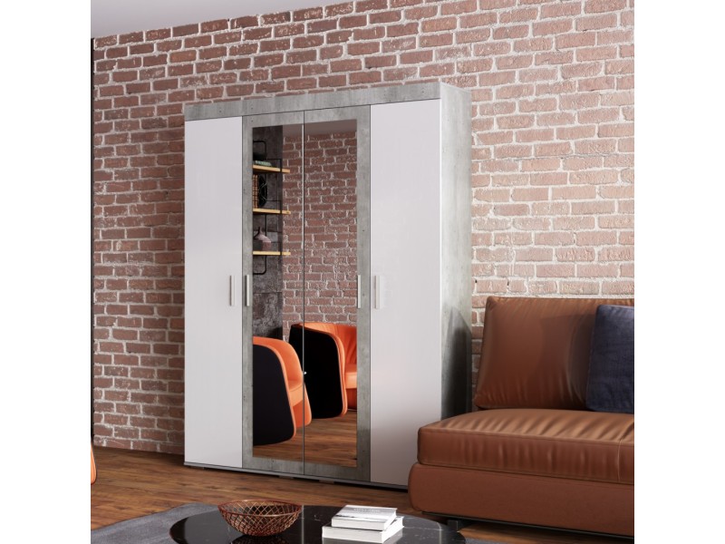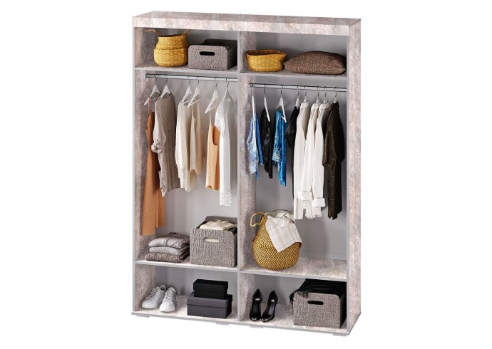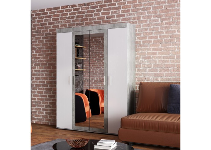 Современный четырёхстворчатый шкаф "Инстайл" выполнен в стиле одноименной модульной коллекции мебели. Модель состоит из четырех дверок, две из которых – зеркальные. Изделие выполнено в комбинации белого и цвета "бетон". Шкаф состоит из двух отделений со штангами, а также верхних и нижних полок для вещей. По желанию Вы можете заменить штанги полками ПЛ-08, которые приобретаются отдельно.