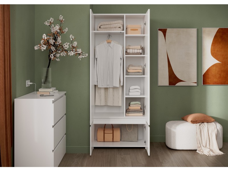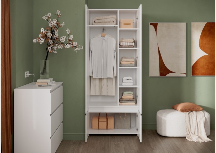 Комбинированное наполнение: Удачное сочетание полок и отделения с штангой позволяет удобно хранить как сложенные вещи, так и одежду на вешалках.