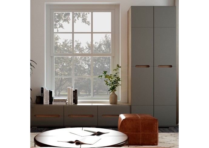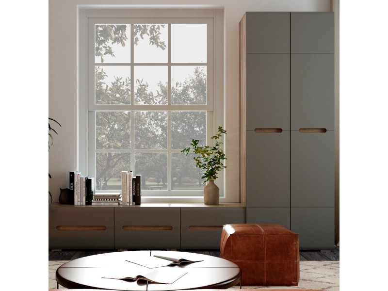 Модульная коллекция «Наоми» – это стильное современное решение в контрастном сочетании корпуса «дуб каньон» с элегантным матовым фасадом насыщенного грифельного оттенка. Оригинальное конструктивное решение коллекции – ручки фасадов, выполненные путем сложной фрезеровки с максимально реалистичным декором дубового спила.