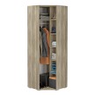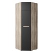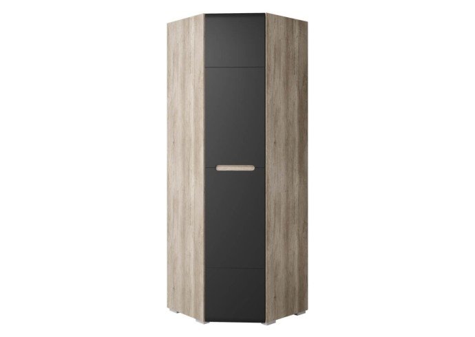С умом использовать пространство поможет угловая модель шкафа "Наоми" из одноименной модульной серии. Изделие выполнено из ЛДСП, фасад распашной дверцы состоит из МДФ темного цвета и имеет встроенную ручку. Внутри шкаф разделен на две зоны для размещения одежды на вешалках и хранения сложенных вещей на полках.