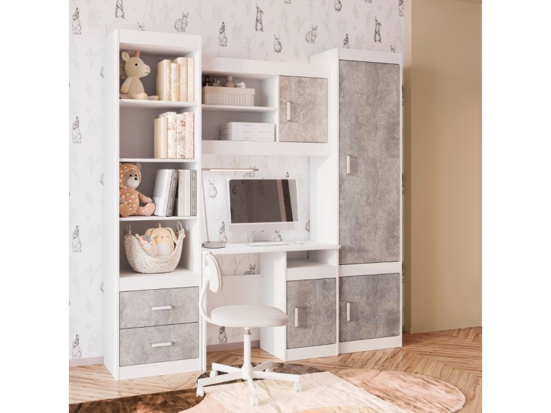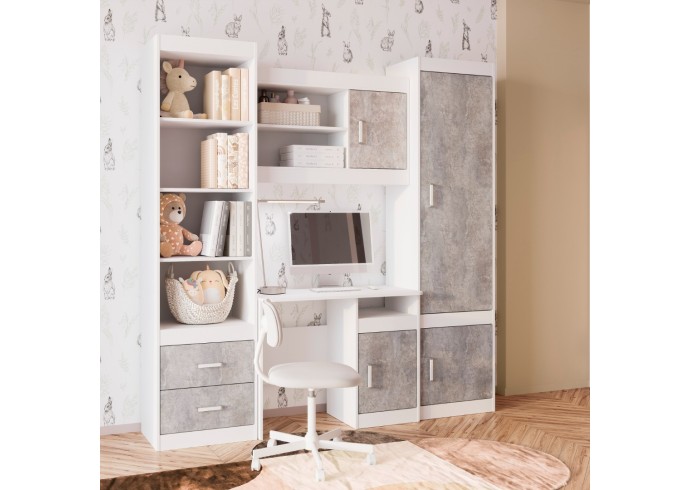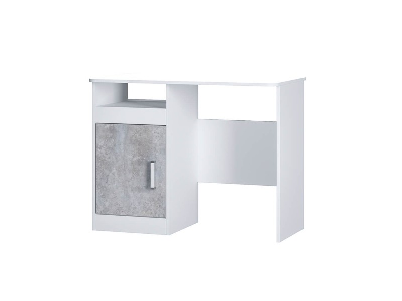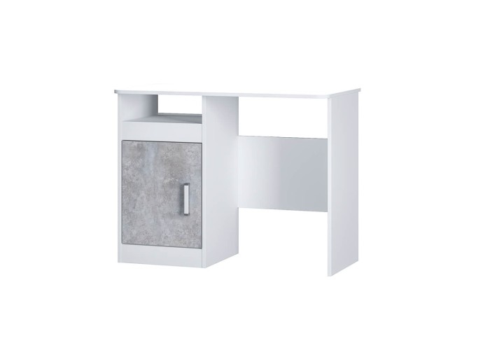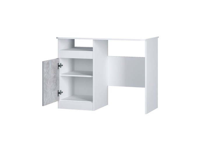 Письменный стол "Паскаль" – прекрасный выбор для организации рабочего места в кабинете или детской. За счёт сочетания цветов белый и цемент светлый он впишется в любой интерьер, разместить все необходимые документы, вещи или канцелярские принадлежности можно в открытой нише или закрытых полках, находящихся под столешницей.