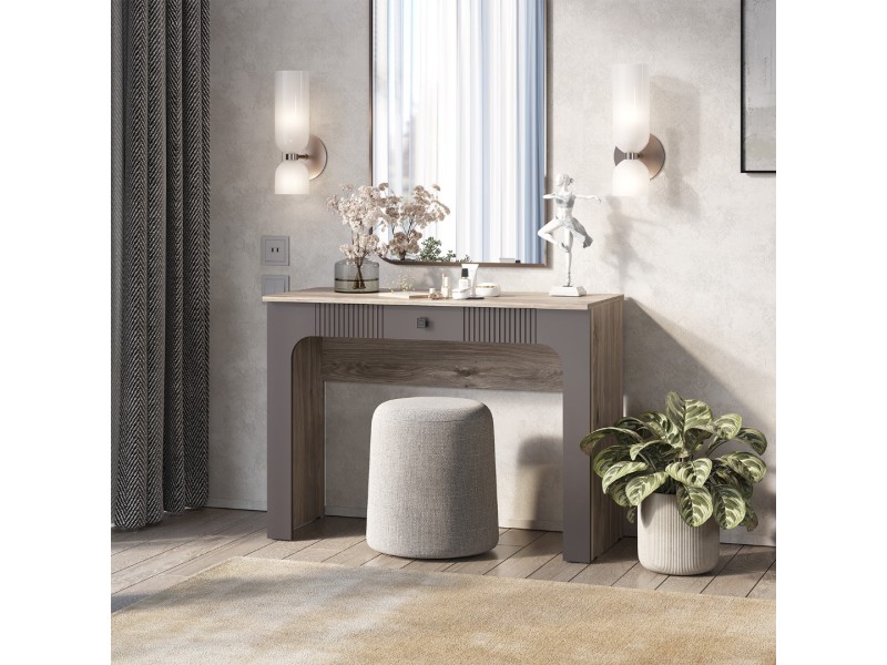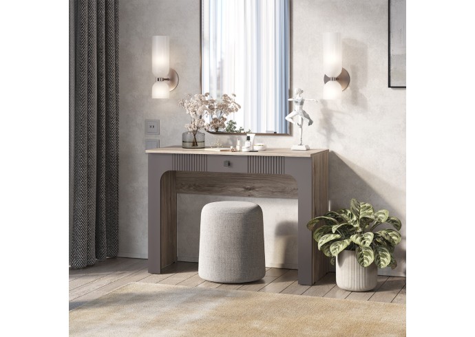 Туалетный столик «Кассандра» станет эстетичным штрихом вашего интерьера. В компактном ящике поместится вся необходимая косметика и украшения, а на верхней полке можно разместить зеркало и небольшой светильник.