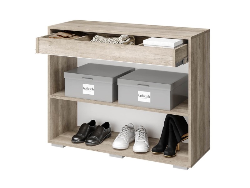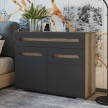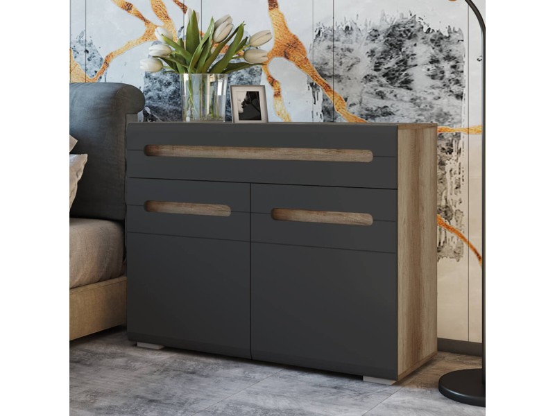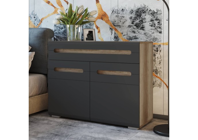 Неглубокая тумба "Наоми" может использоваться в любой комнате вашей квартиры или дома. Модель оснащена одним выдвижным ящиком и двумя распашными дверцами, за которыми находятся полки для хранения. Изделие имеет характерную для коллекции "Наоми" отделку: корпус выполнен из ЛДСП в цвете "дуб каньон", а темно-серые фасады имеют интегрированные ручки.