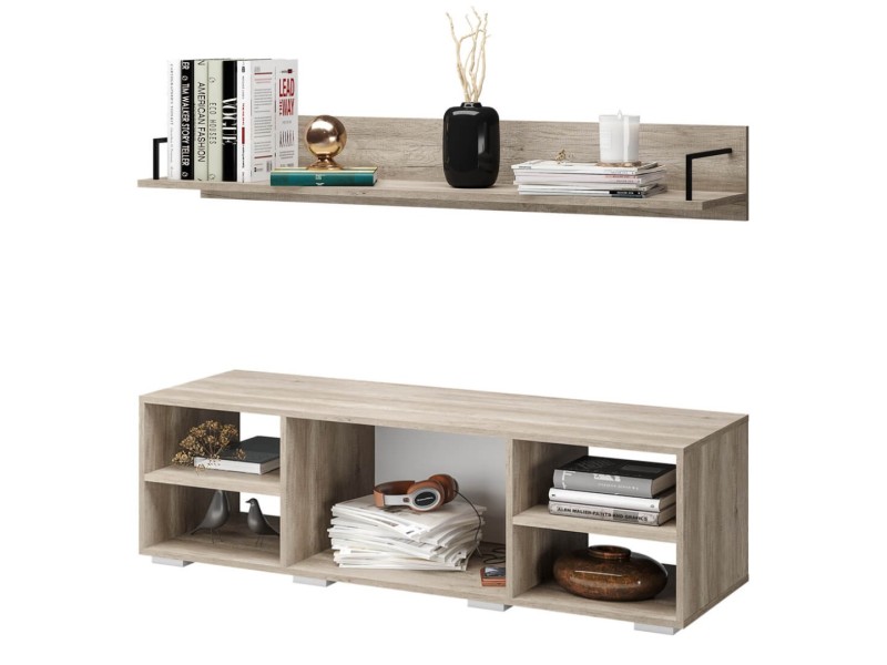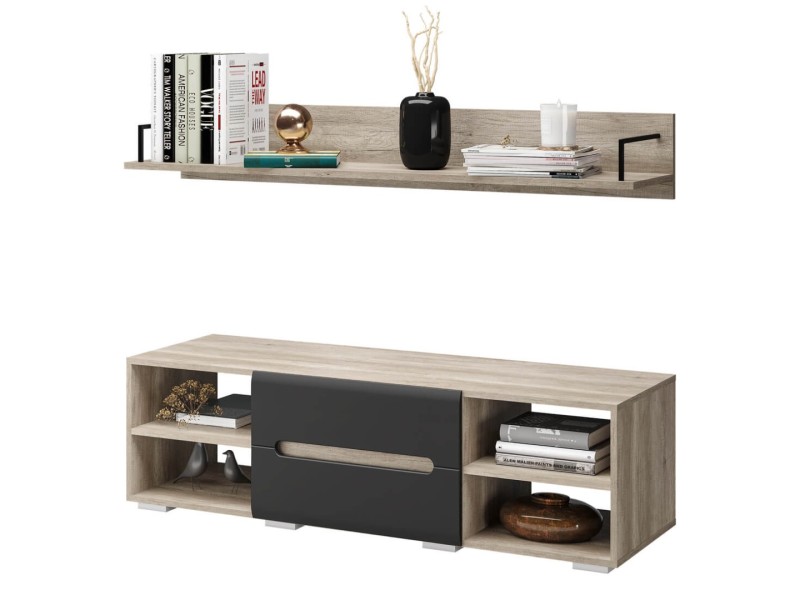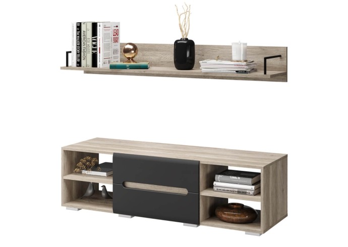 Стильная и очень вместительная комбинация из тумбы под ТВ и полки "Наоми" является частью одноимённой модульной серии. Модель выполнена из качественной ЛДСП в цвете "дуб каньон", а фасад одного из ящиков отделан МДФ темного серого цвета. На столешнице тумбы поместится телевизор практически любого размера, а в нишах можно хранить необходимую технику. Навесная полка станет прекрасным решением для размещения предметов декора, книг или рамок с фотографиями. Створка у тумбы распашная.