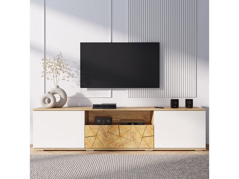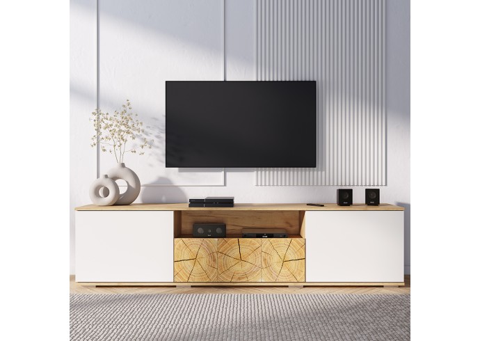 Яркий штрих модели - стильные вставки, стилизованные под спил дерева. Тумба отлично дополнит гостиную, на ней можно разместить телевизор и приставку, а также небольшую технику и колонку.