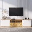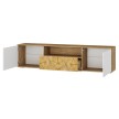 Тумба под ТВ из коллекции «Тиволи» сочетает три функциональных зоны для хранения: вместительный ящик, открытую узкую полку и еще две просторных полки, скрытых за дверцами.